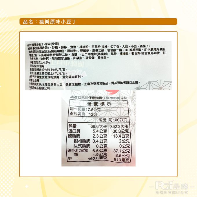 過敏原:本產品含有大豆、麩質之穀物、芝麻及堅果其製品,對其過敏者請勿食用。