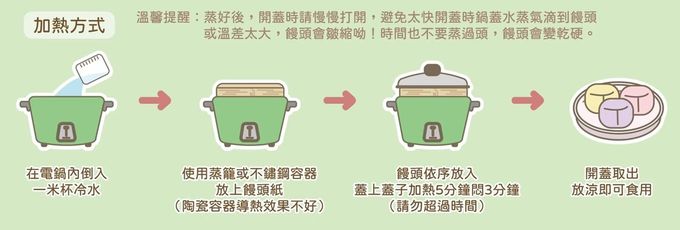 加熱方式 :饅頭冷凍取出後無需退冰,電鍋外鍋放入一杯冷水,將饅頭連同饅頭紙放入不鏽鋼容器中一起放入電鍋,蓋鍋蓋時可以夾一根筷子避免鍋內蒸氣過多,加熱5分鐘,電鍋跳起後悶3分鐘即可開蓋取出。