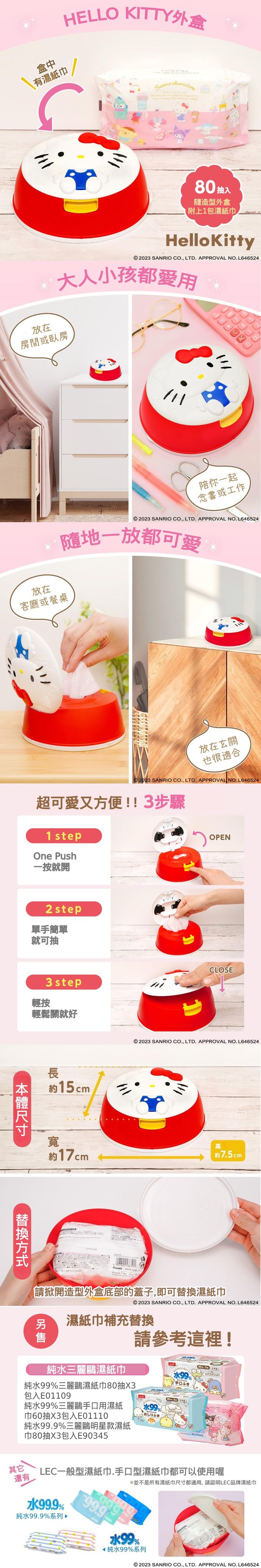 本組合內含:三麗鷗造型濕紙巾盒一款(盒內含一包純水99.9%濕紙巾80抽1包)