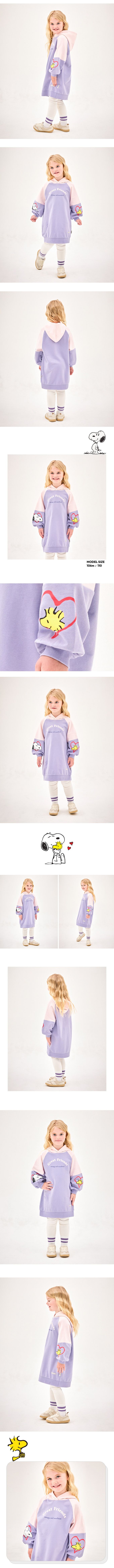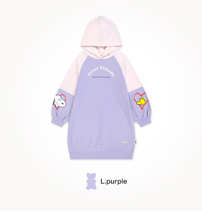 韓國 Jelispoon - (聯名款)卡通人物史努比拼色長袖連帽洋裝-淡粉X淺紫