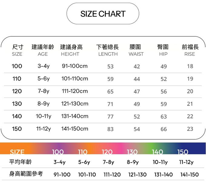 1. 尺寸表單位皆為公分(cm),實際尺寸會因布料彈性、水洗、測量起迄點等因素略有誤差。建議參考孩子平時穿著衣物尺寸進行選購。