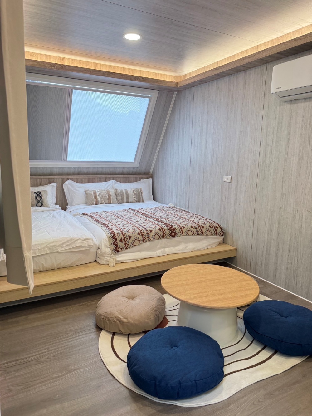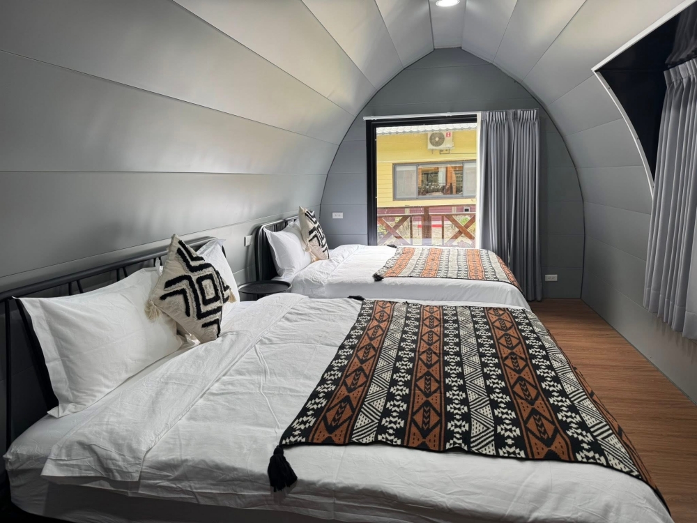 這次我們住的是「奶油風渡假小屋」,空間真的蠻大,兩張雙人床+一組小沙發,小孩直接翻滾也沒問題。兩面大面積的玻璃,隨時都能拉開窗簾看見山景!房間整體設計簡單乾淨,床頭還有插座,晚上充電不用煩惱。而且也有冷暖氣,就算夏天、冬天入住也都很素西~