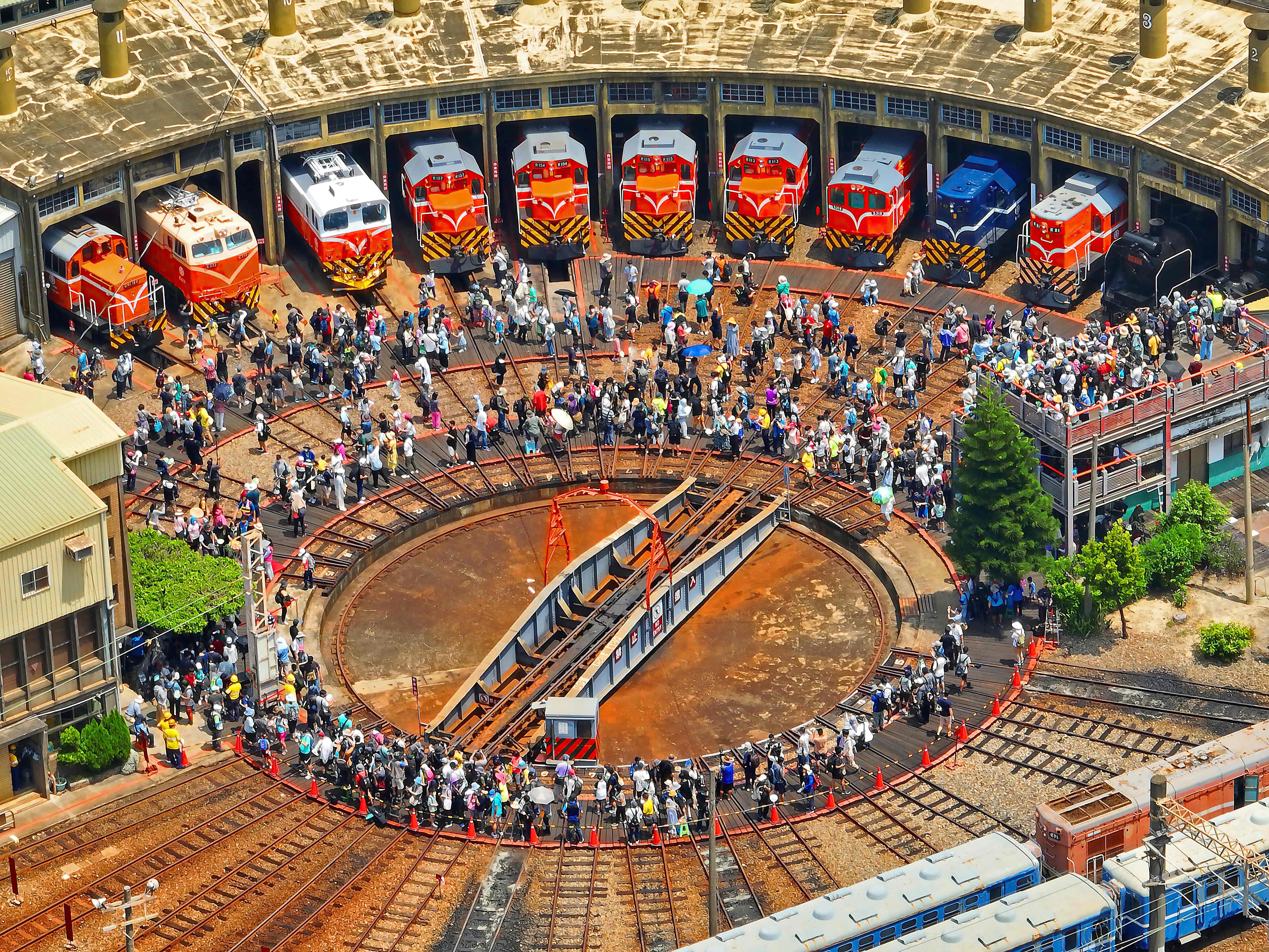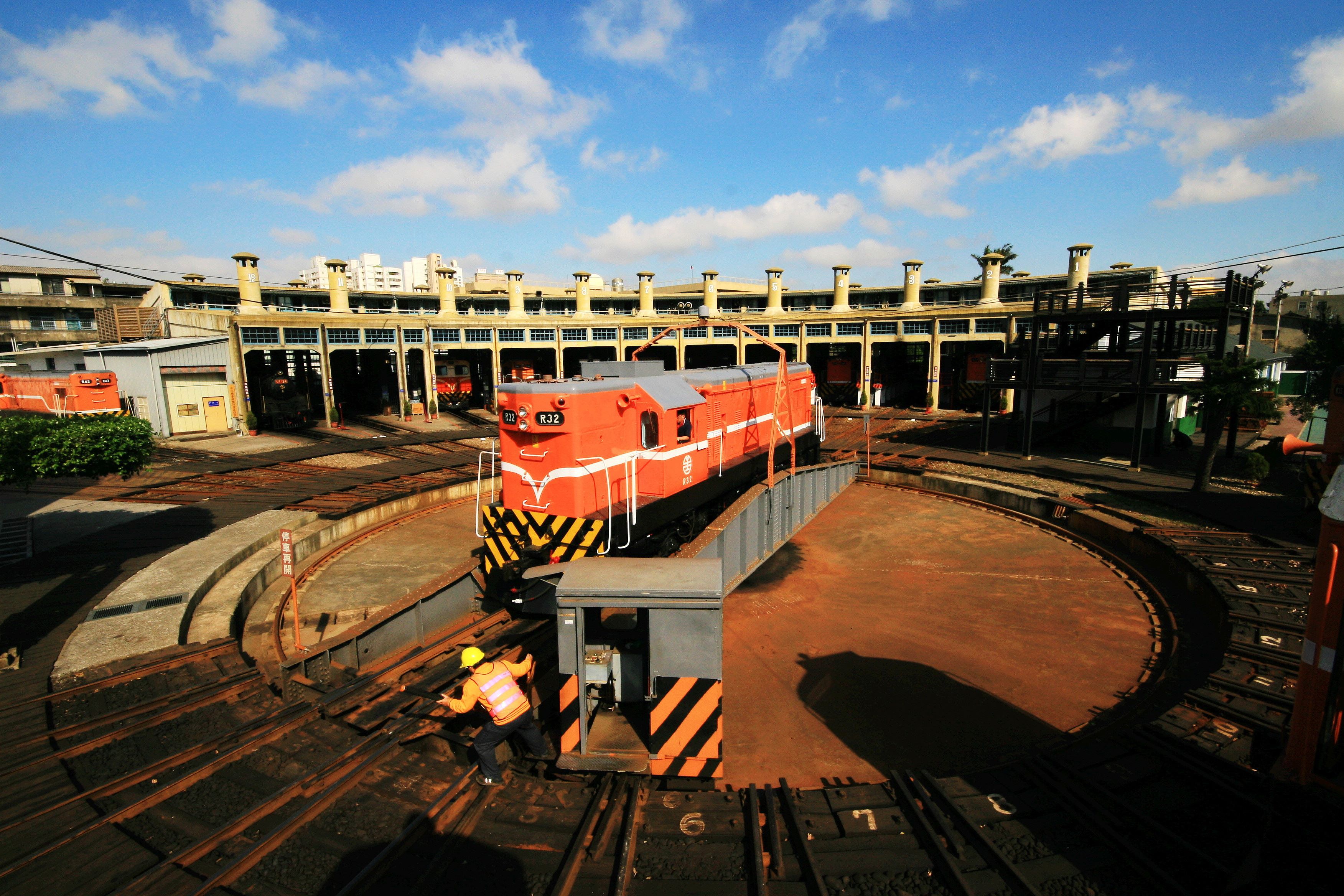 扇形車站是臺灣鐵道文化保存完善的珍寶,也是全台碩果僅存的「火車頭旅館」。走上觀賞台,從高處俯瞰整個扇形車庫的風貌,可見火車隨著正中央的360度調車轉盤緩緩旋轉,這個轉盤是火車進出的樞紐,緊接著12個股道,以半圓弧之姿朝車庫方向分散,搶眼的輻射狀線條,十分特殊。還有國寶級的蒸汽火車靜靜的在一旁,與旅人一同細數歷史文化的時光軌跡。