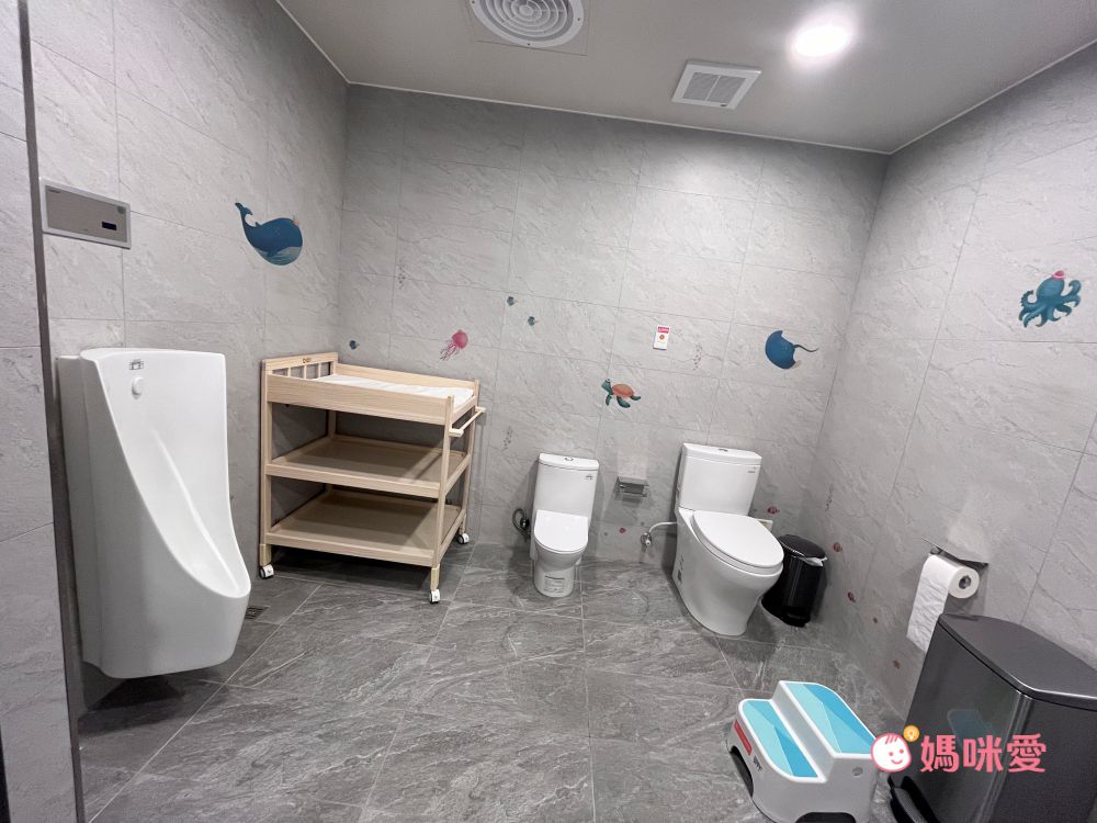 G編覺得馥御花園酒店真的是親子友善酒店,歡樂室的洗手間就是直接設有尿布台、兒童馬桶、輔助小椅子等等的友善設施,讓寶貝們或者是媽媽們也都能很方便的使用。