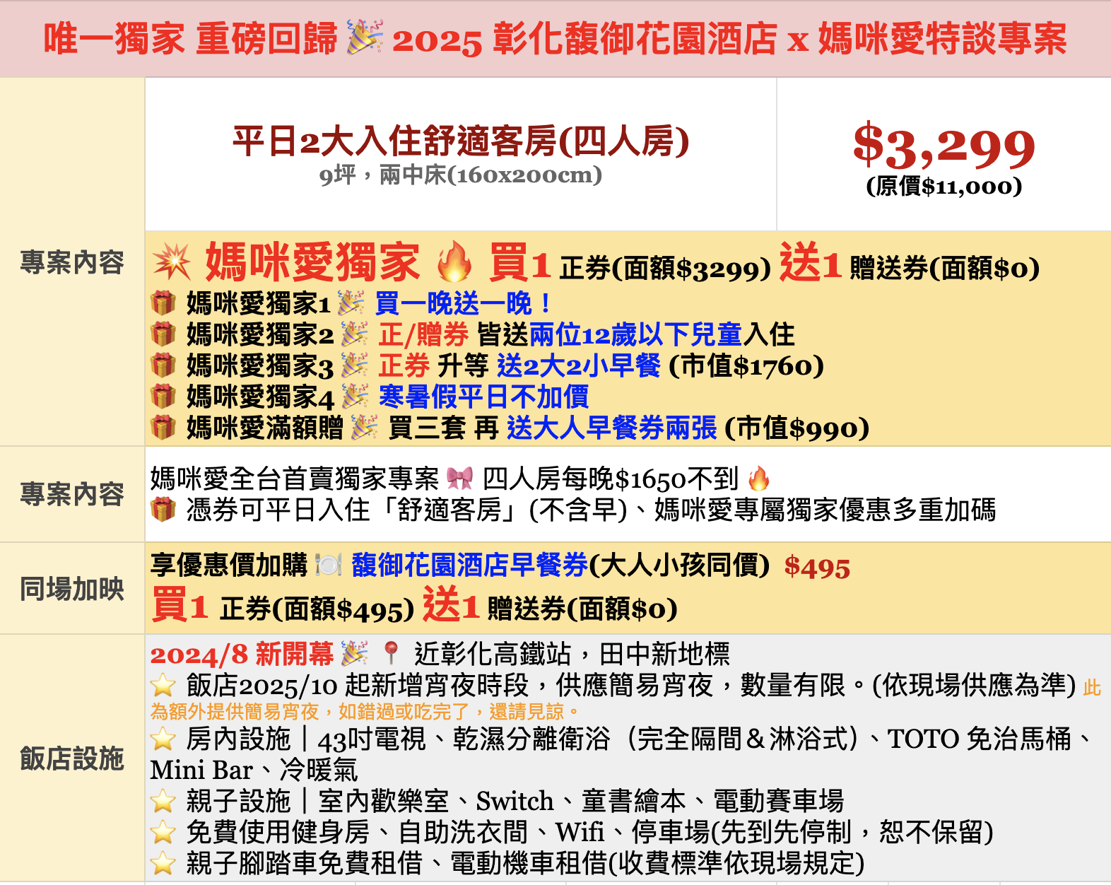 🎁 媽咪愛獨家3 🎉 正券 升等 送2大2小早餐 (市值$1760)