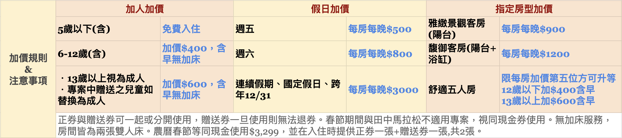 加價第五人入住即可升等,數量有限,依現場房況為主。 第五位需加價:12歲以下+400、13歲以上+600。