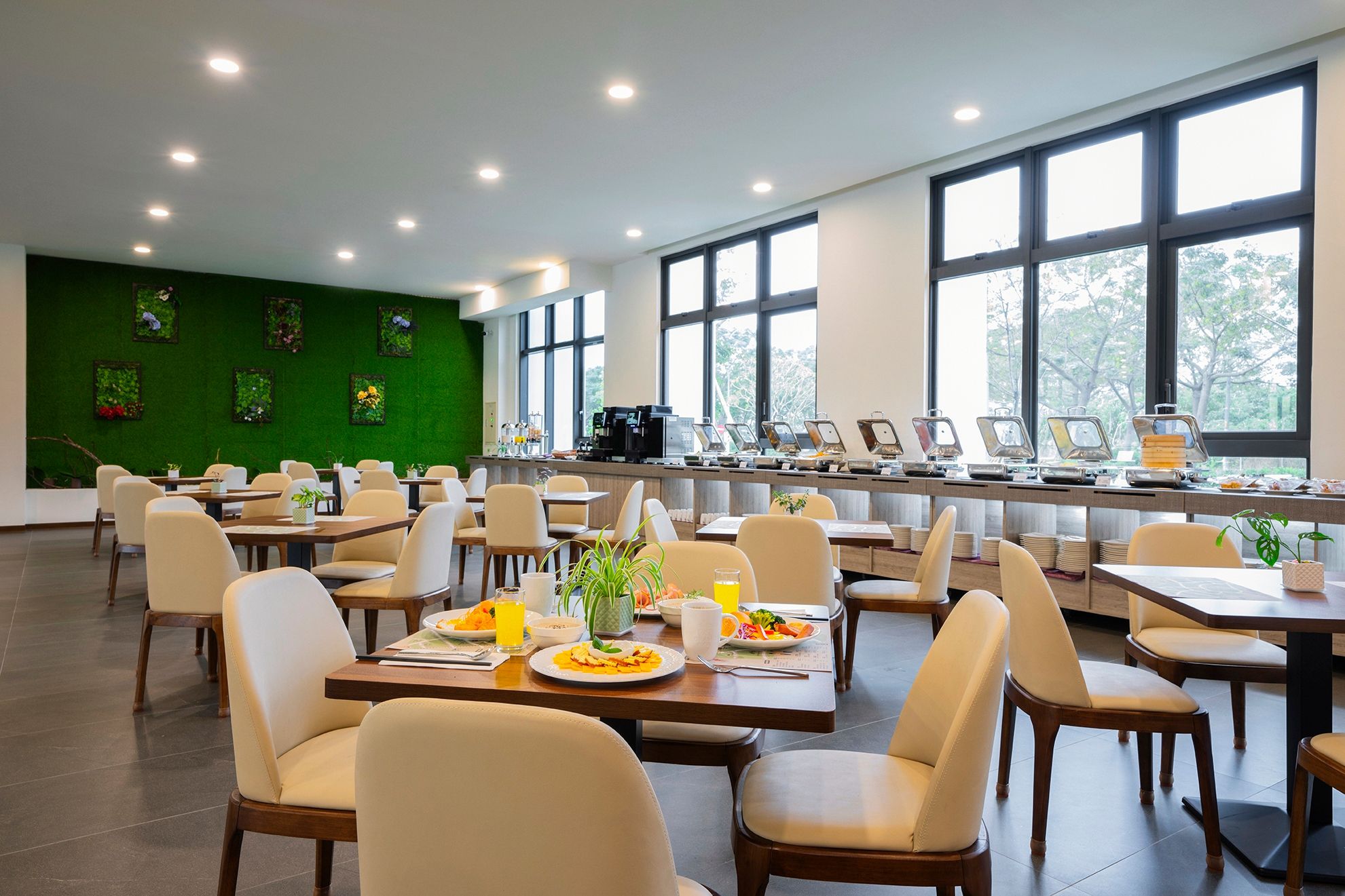 到了晚餐時間去用餐,餐廳就設在大廳櫃檯的左手邊!空間一樣非常的寬敞跟明亮,而且桌子跟桌子之間的距離不會太近,坐起來非常舒適。