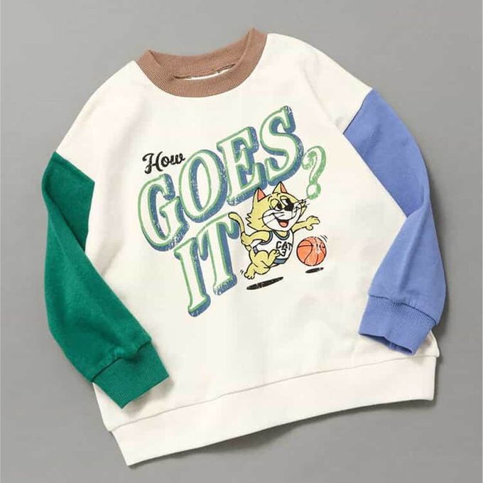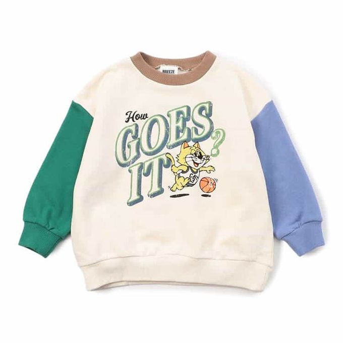 日本 BREEZE - 美式印花縮口長袖上衣-貓貓打籃球-米白