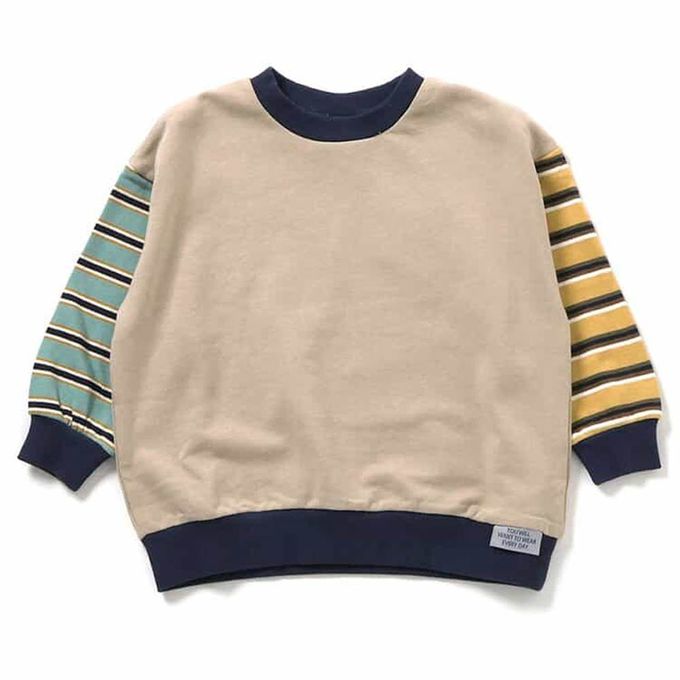 日本 BREEZE - 100%棉 落肩寬鬆縮口長袖上衣-素面X條紋袖-米杏
