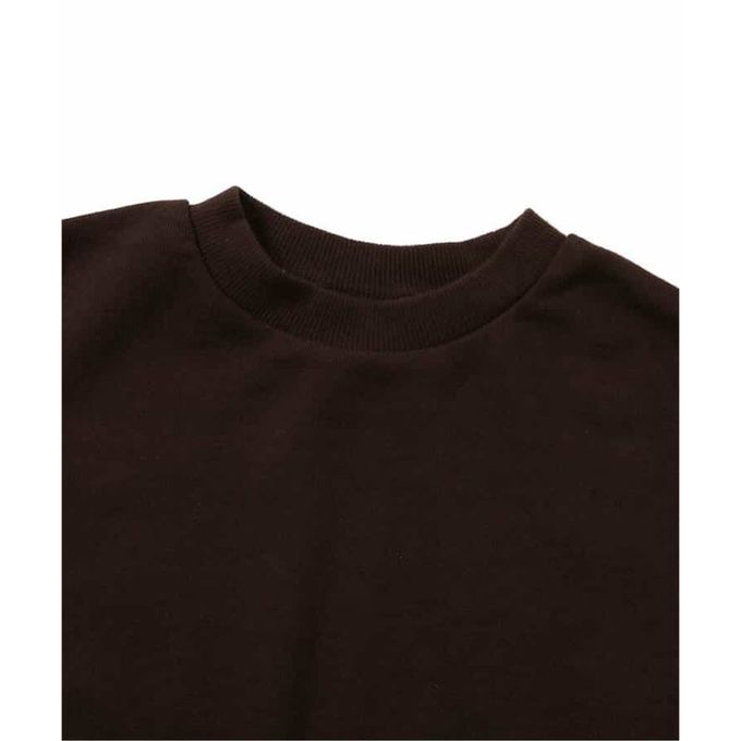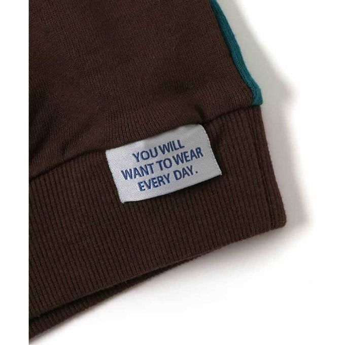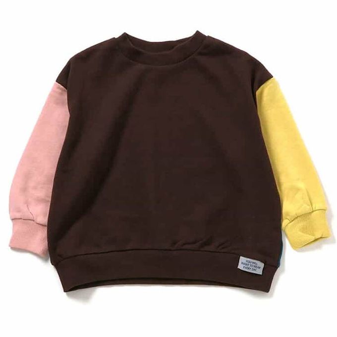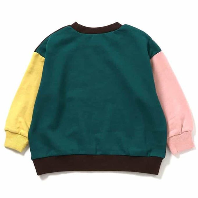 日本 BREEZE - 100%棉 落肩寬鬆縮口長袖上衣-撞色-黑X棕X藍綠