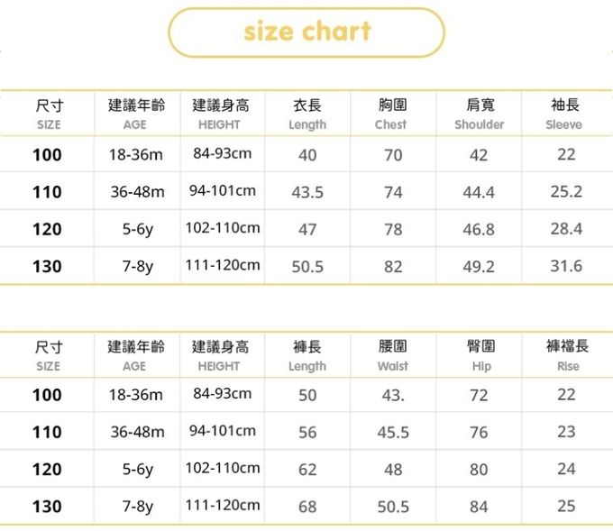 1. 尺寸表單位皆為公分(cm),實際尺寸會因布料彈性、水洗、測量起迄點等因素略有誤差。建議參考孩子平時穿著衣物尺寸進行選購。