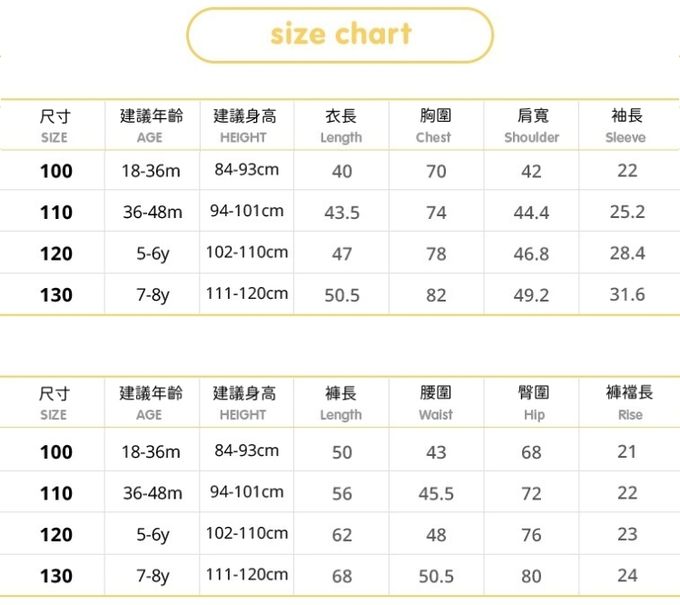 1. 尺寸表單位皆為公分(cm),實際尺寸會因布料彈性、水洗、測量起迄點等因素略有誤差。建議參考孩子平時穿著衣物尺寸進行選購。