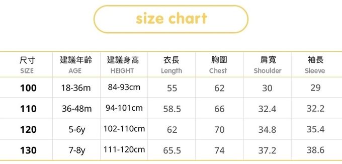 1. 尺寸表單位皆為公分(cm),實際尺寸會因布料彈性、水洗、測量起迄點等因素略有誤差。建議參考孩子平時穿著衣物尺寸進行選購。
