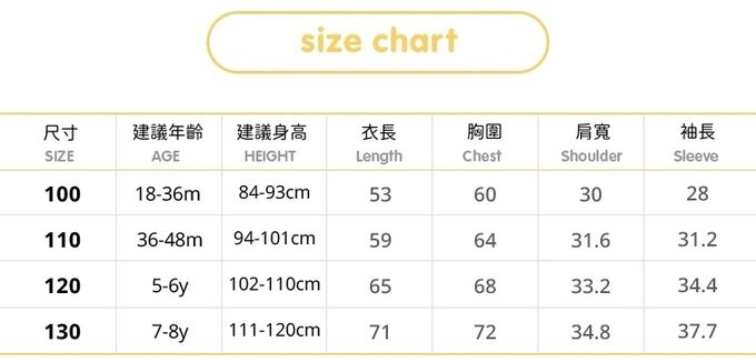 1. 尺寸表單位皆為公分(cm),實際尺寸會因布料彈性、水洗、測量起迄點等因素略有誤差。建議參考孩子平時穿著衣物尺寸進行選購。