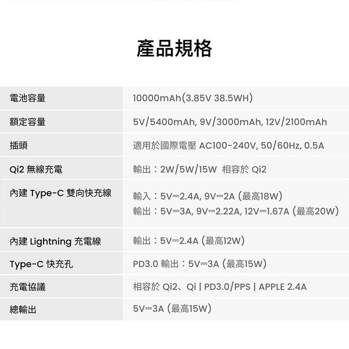充電協議:相容於Qi2、Qi | PD3.0/PPS | APPLE 2.4A