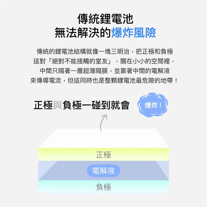 PhotoFast SSB 固態行動電源採用自研「獨家防爆固態配方」,就像把會流動的水換成穩定的果凍,從根本解決鋰電池爆炸風險,即使從高處摔落、重擊或刺穿,都不需要擔心爆炸!但還是建議保持正確的使用方式喔,以保行動電源的使用壽命。