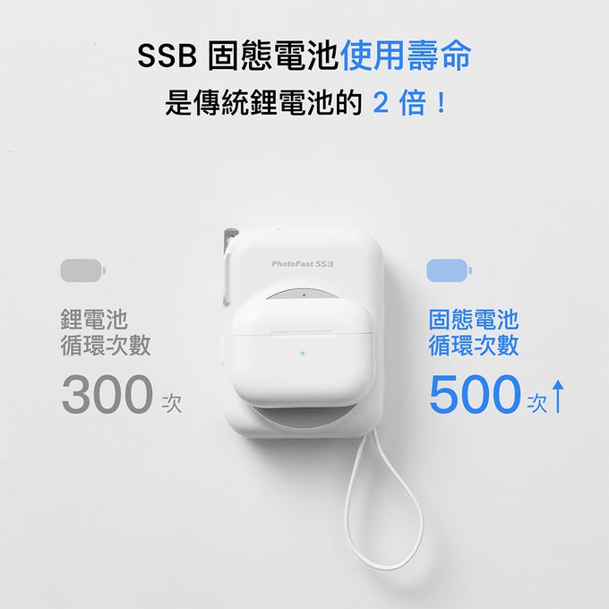 PhotoFast SSB 固態行動電源的充放電循環,是傳統鋰電池的 2 倍!一般來說固態電池可達 500 次以上充放電循環,是一般鋰電池(約 300 次)的約 2 倍以上,能夠確保更長久的使用安全。