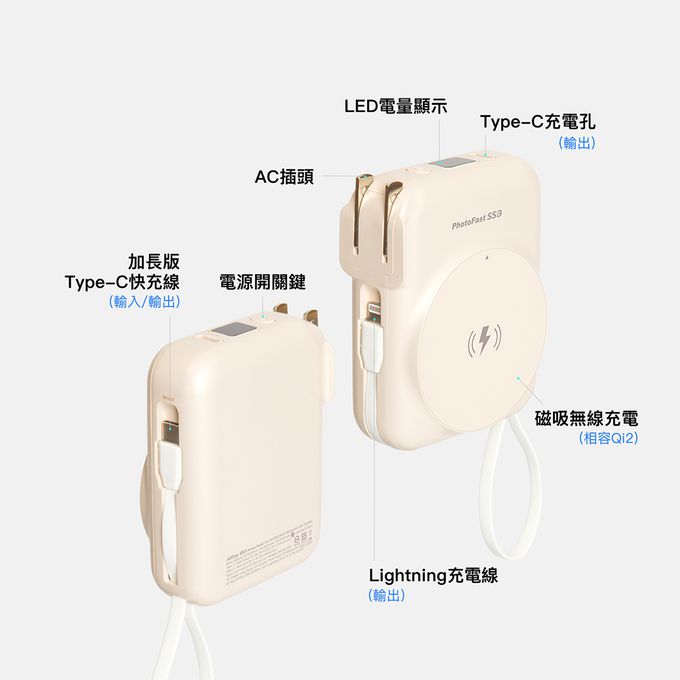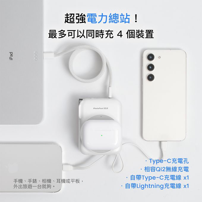 SSB AllDay 充在當「行動電源」使用時,可以同時充 4 台設備。考量到邊充電、邊放電可能造成升溫,手機也會跟著升溫,注重安全考量的 PhotoFast 特別設計了「溫控的保護機制」,在爲 SSB AllDay充蓄電時「插頭蓄電時/當充電頭使用時」,為了避免發燙,會「自動關閉無線充電」的輸出,其他內建的兩條線跟 Type-C 孔,都一樣可以正常充電哦,可以同時充 3 台設備喔!