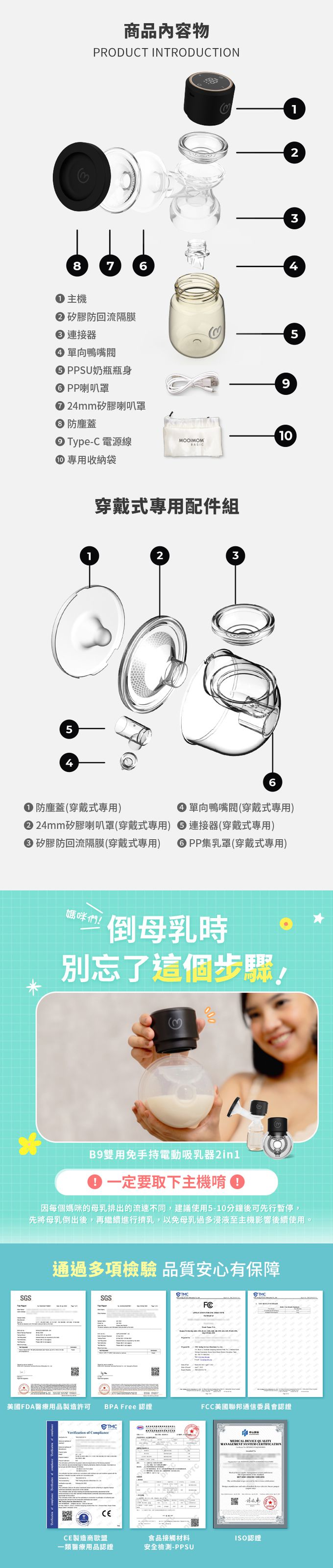 10.B9雙用免手持電動吸乳器2in1配件為專用設計,無法與其它款電動吸乳器共用。