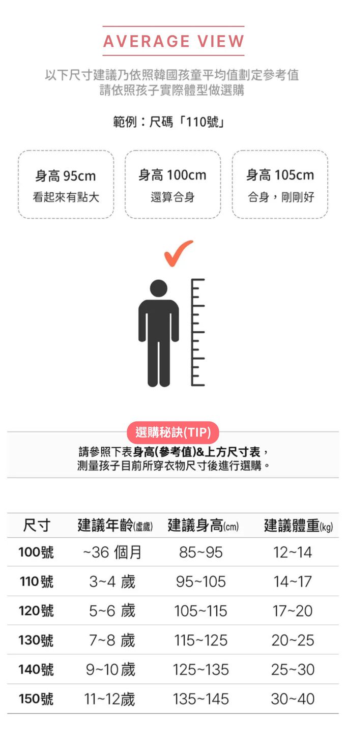 2. 每個尺寸的月數和建議年齡僅供參考,體重和體型可能會根據寶寶的生長發育而有所不同,建議參考寶貝現有的衣物尺寸做對照。