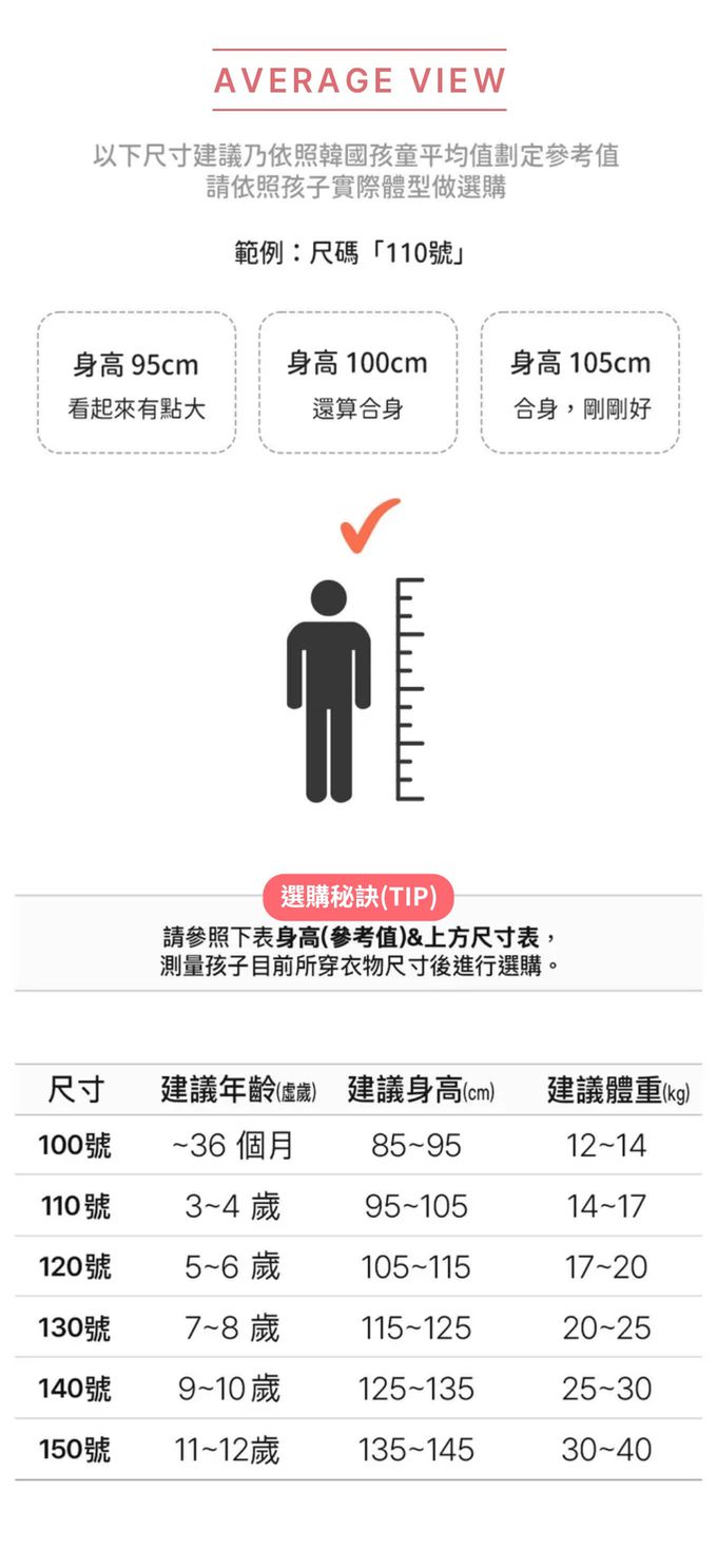 2. 每個尺寸的月數和建議年齡僅供參考,體重和體型可能會根據寶寶的生長發育而有所不同,建議參考寶貝現有的衣物尺寸做對照。