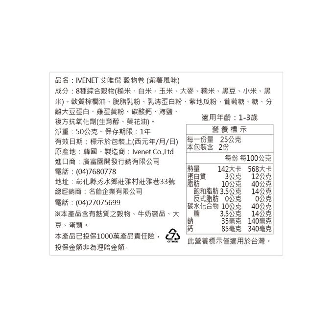 成分:【穀物卷-紫薯風味】 成分:8種綜合穀物(糙米、白米、玉米、大麥、糯米、黑豆、小米、黑米)。軟質棕櫚油、脫脂乳粉、乳清蛋白粉、紫地瓜粉、葡萄糖、糖、分離大豆蛋白、雞蛋黃粉、碳酸鈣、海鹽、複方抗氧化劑(生育醇、葵花油)。