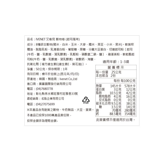 成分:【穀物卷-起司風味】 成分:8種綜合穀物(糙米、白米、玉米、大麥、糯米、黑豆、小米、黑米)。軟質棕櫚油、脫脂乳粉、乳清蛋白粉、葡萄糖、蔗糖、分離大豆蛋白、切達起司粉〔起司(牛奶、鹽、乳酸菌、凝乳酵素)、乳輕粉、磷酸氫二鈉、鹽〕、雞蛋黃粉、軟乾酪起司粉(牛奶、鹽、乳酸菌、凝乳酵素)、碳酸鈣、海鹽、複方抗氧化劑(生育醇、葵花油)。