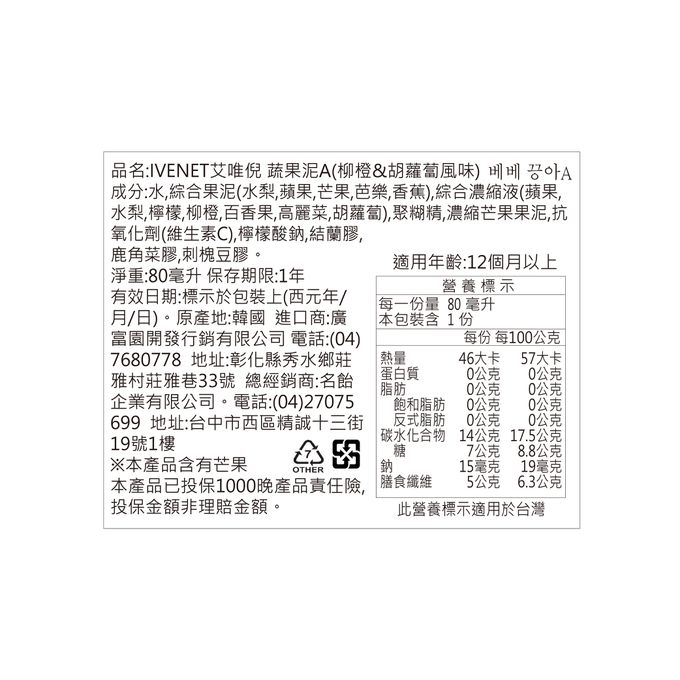 品名:蔬果泥 A柳橙胡蘿蔔 80ml/包