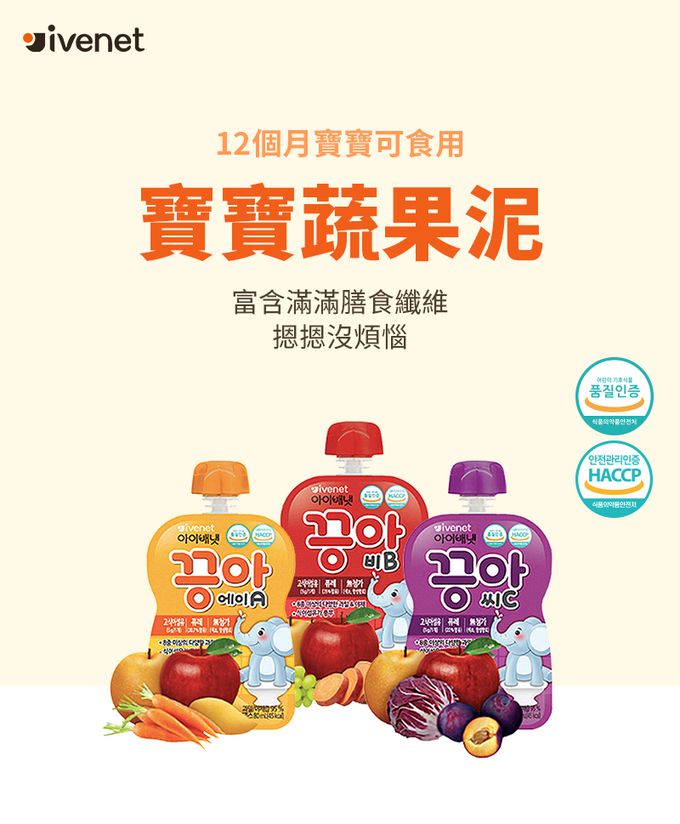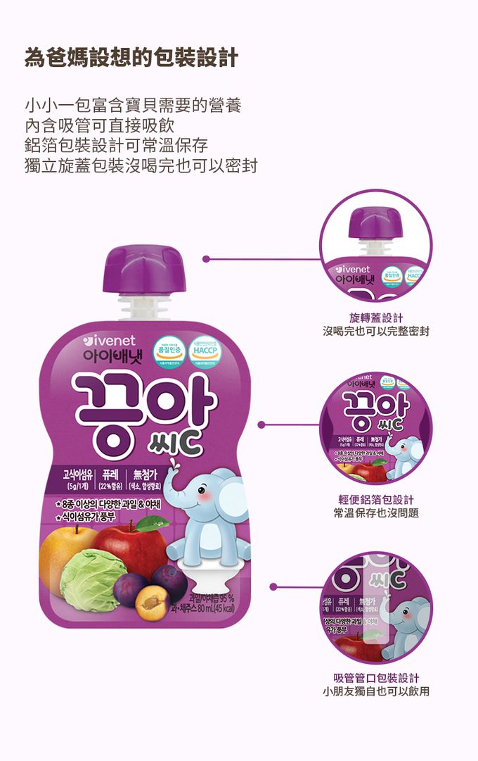 成分:水、綜合果泥(水梨、蘋果、芒果、芭樂、香蕉)、綜合濃縮液(蘋果、水梨、檸檬、柳橙、百香果、高麗菜、胡蘿蔔)、聚糊精、芒果濃縮果泥、維生素C(抗氧化劑)、檸檬酸鈉、結蘭膠、鹿角菜膠、刺槐豆膠。