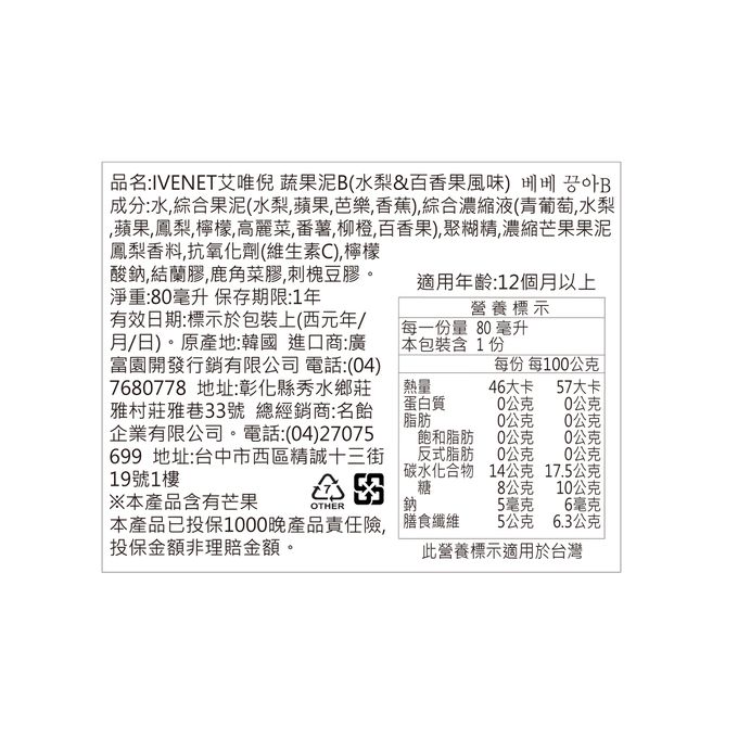 品名:蔬果泥 B水梨百香 80ml/包