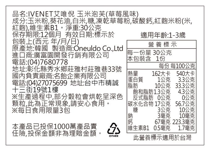 成分:玉米粉,葵花油,白米,糖,凍乾草莓粉,碳酸鈣,紅麴米粉(米,紅麴),維生素B1。