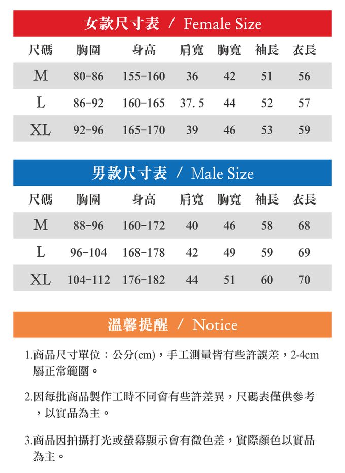 女款M號2件、女款L號2件、女款XL號2件、男款M號2件、男款L號2件、男款XL號2件