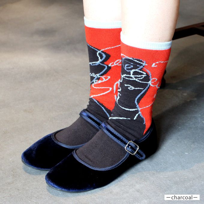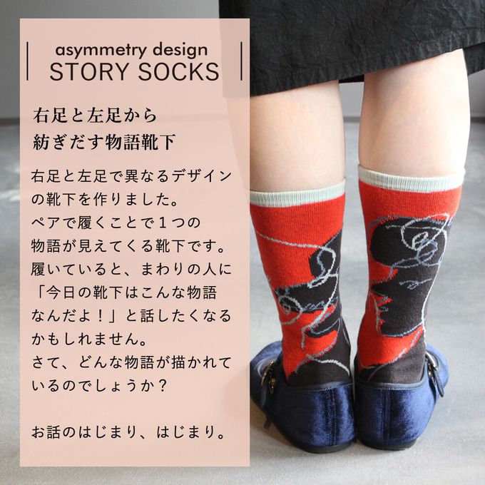 像是狐狸與鶴的款式中,不僅左右腳的花樣不同,正反面的圖案也不一樣喔!一面敘述狐狸邀請鶴到家中吃飯的故事,另一面則是鶴邀清狐狸吃飯的情節。