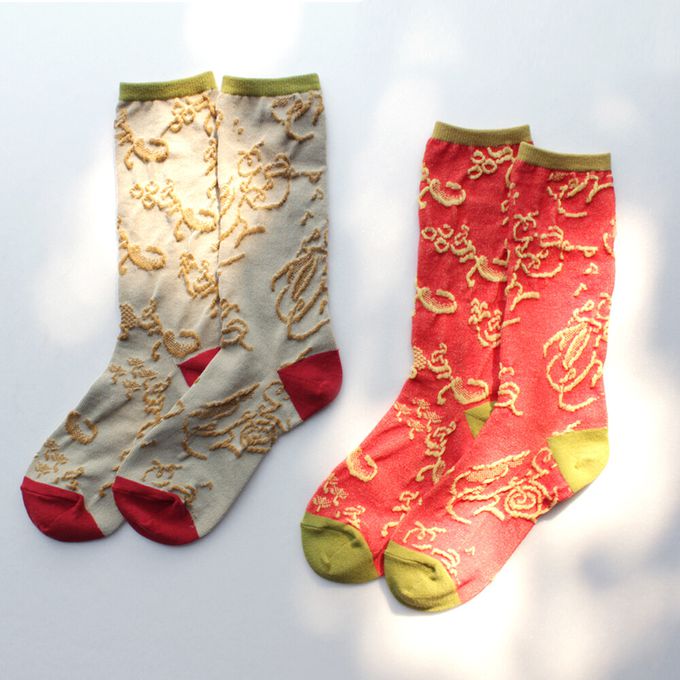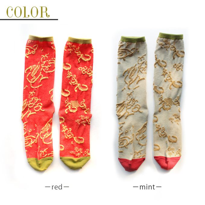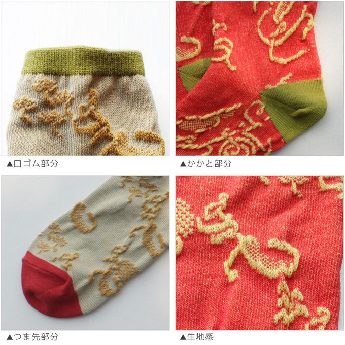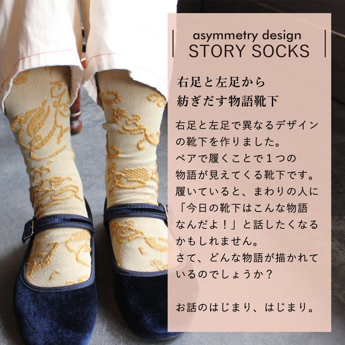 像是狐狸與鶴的款式中,不僅左右腳的花樣不同,正反面的圖案也不一樣喔!一面敘述狐狸邀請鶴到家中吃飯的故事,另一面則是鶴邀清狐狸吃飯的情節。