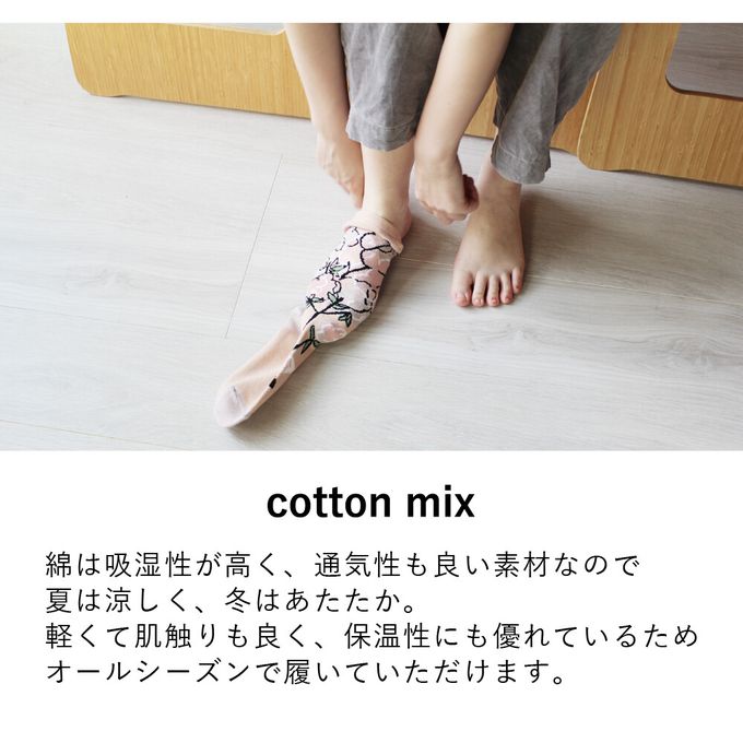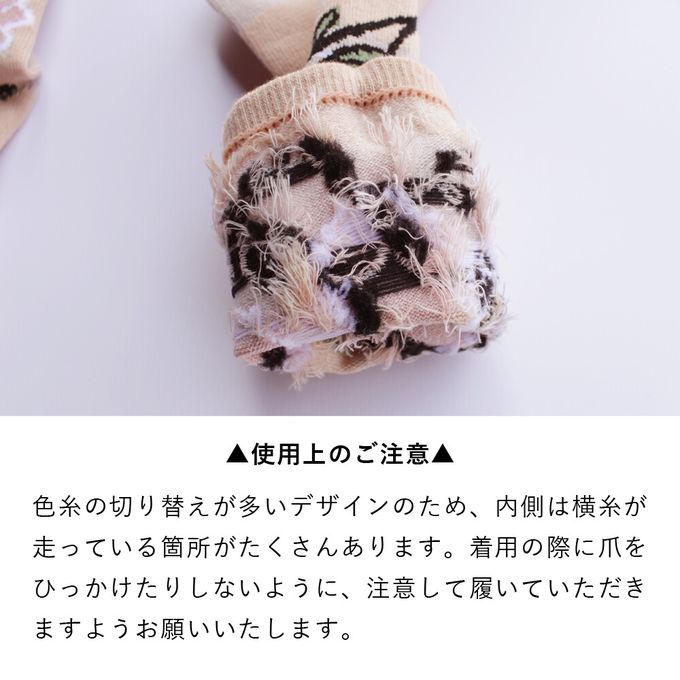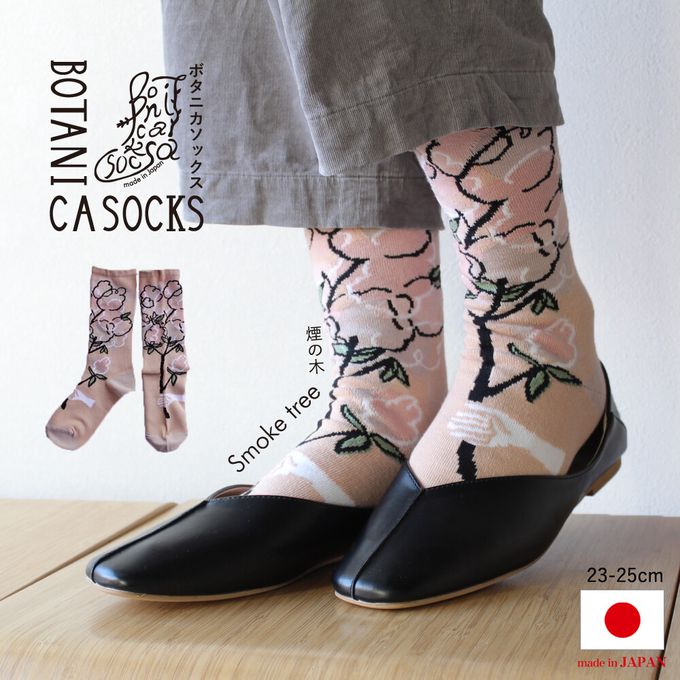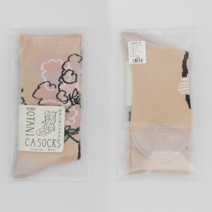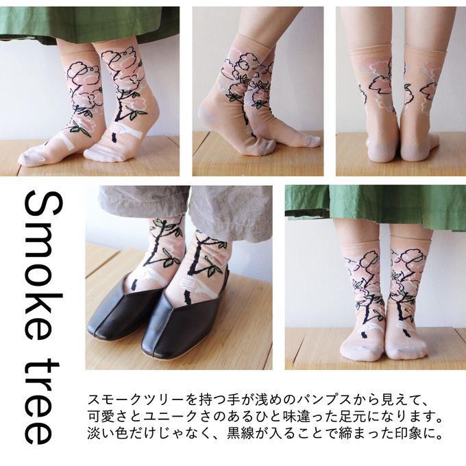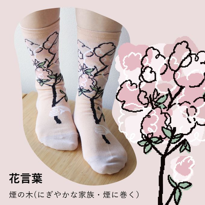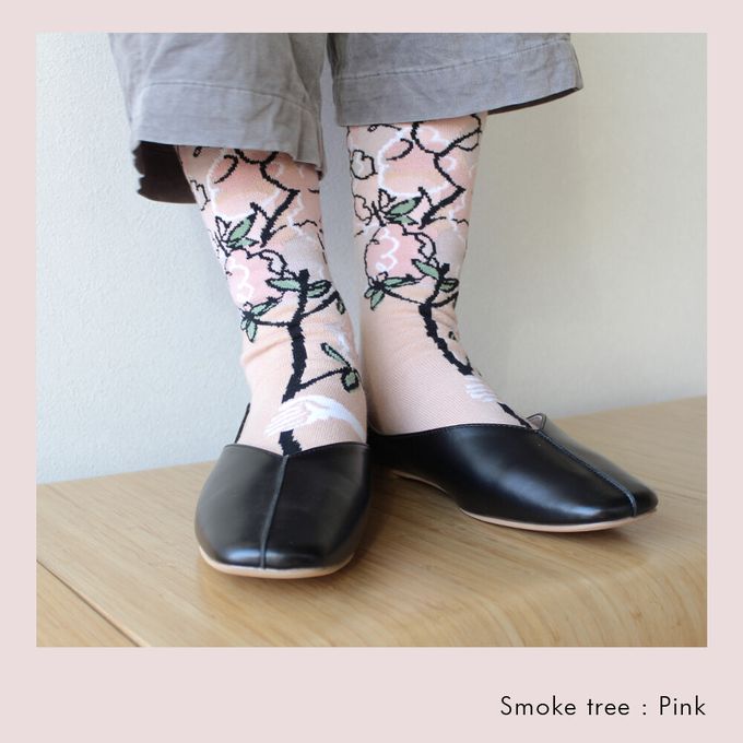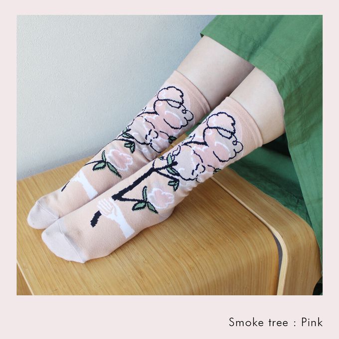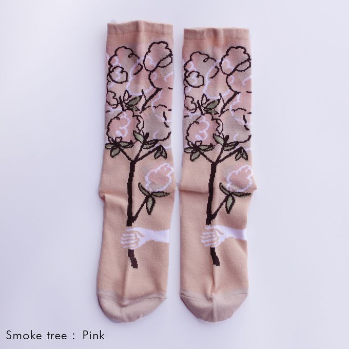 這款設計獨特地描繪了手握煙霧樹枝的樣子。在同一枝上,也用細膩的線條與淡雅的色彩表現出層次感和蓬鬆的感覺,把可愛的外觀完整地封存在襪子上。