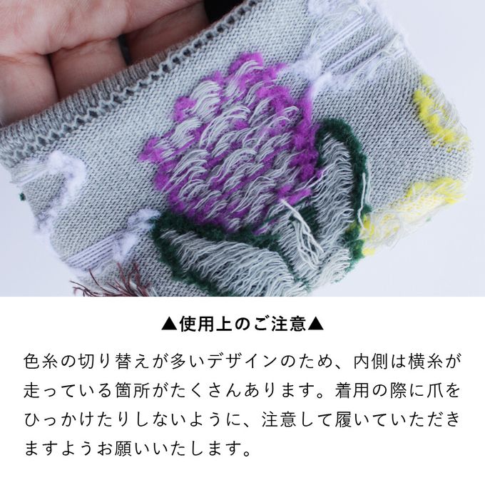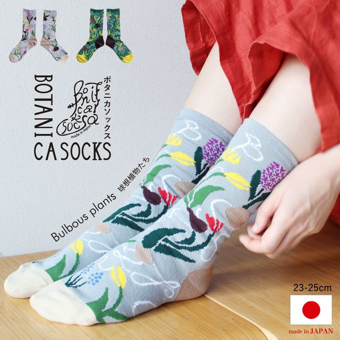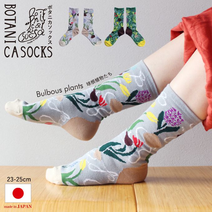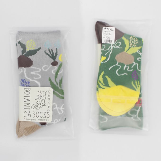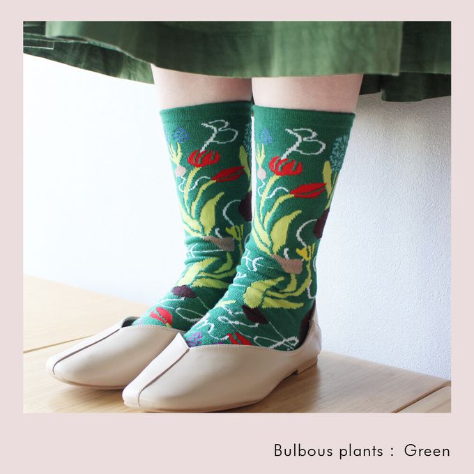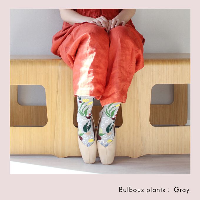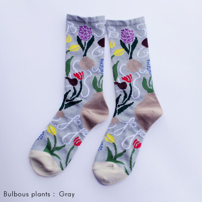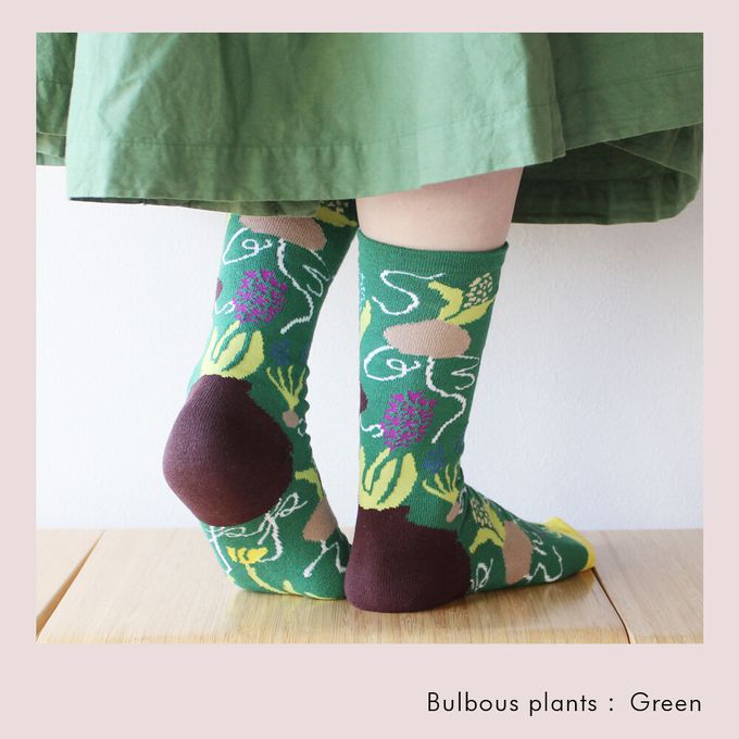 這款襪子的設計充滿趣味:鞋跟的分色處變成了大大的球根,而向各個方向伸展的根莖中,還巧妙隱藏了「Bulbous plants(球根植物)」的文字,充滿俏皮感。