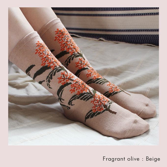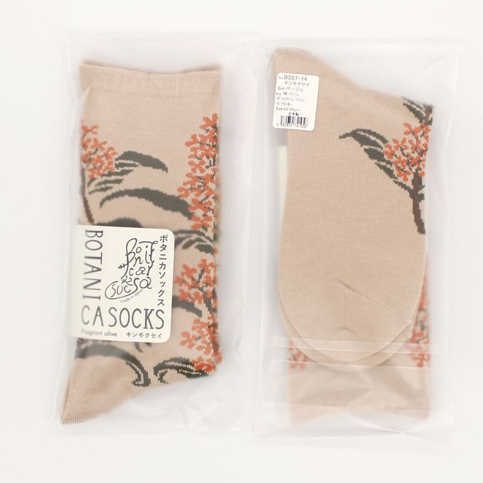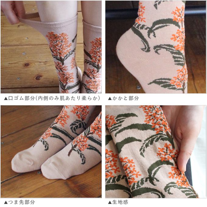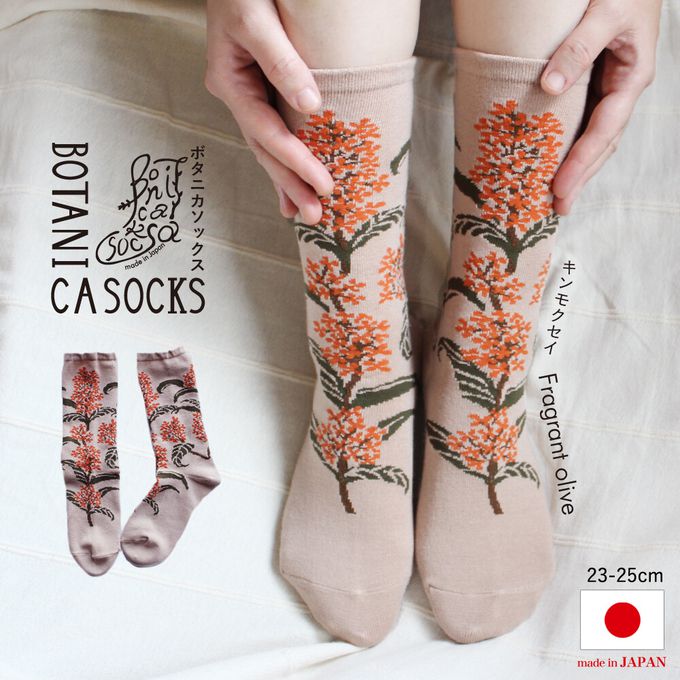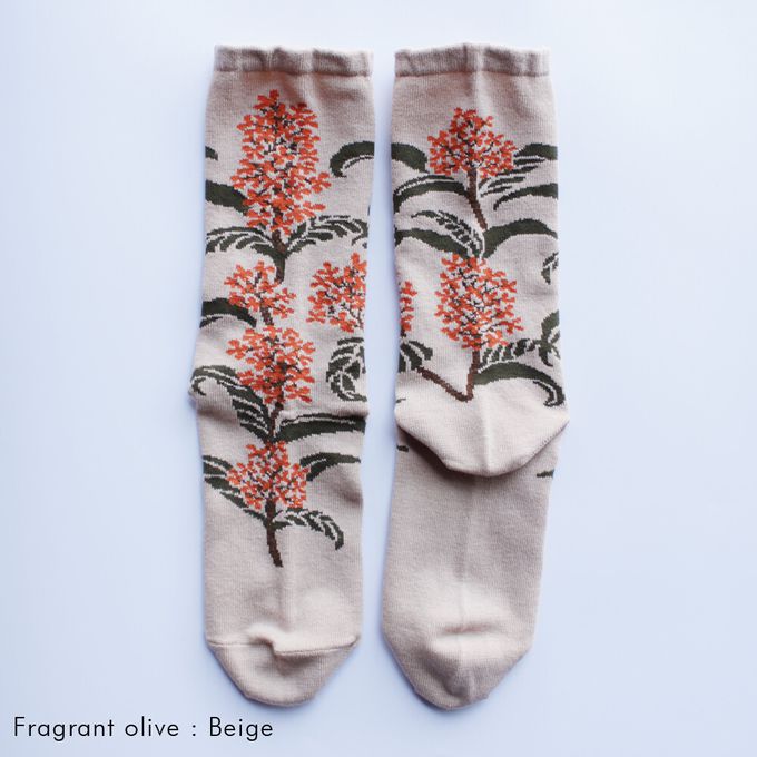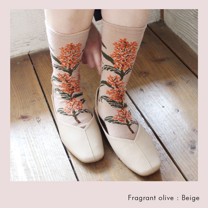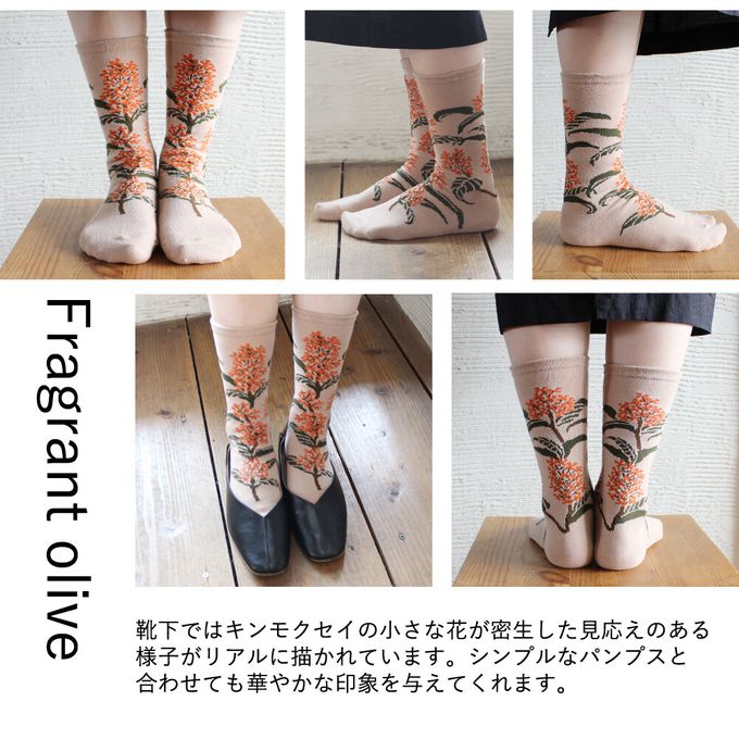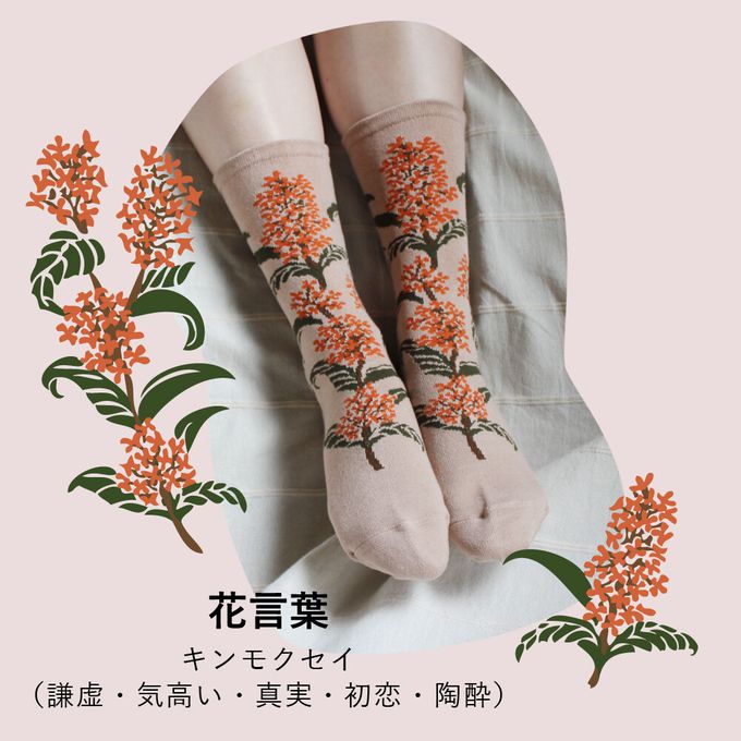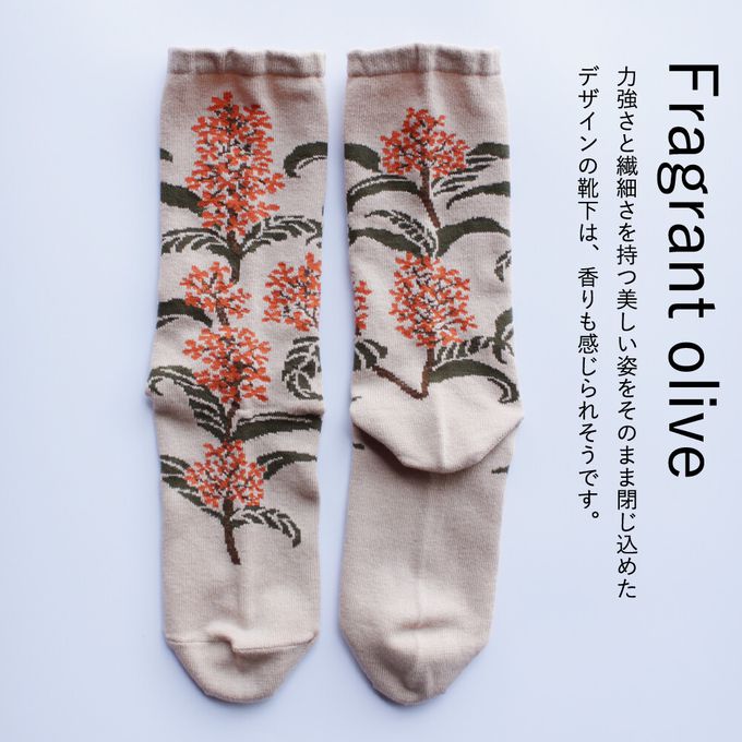 當你走在路上,總能感受到某個角落飄來的淡淡香氣,金木犀(キンモクセイ)便是帶來秋天氣息的植物。雖然香味濃郁,但橙色的小花卻非常細小,密集地盛開在枝頭,呈現出細膩的美感。波浪狀的深綠葉片也是它的特色。這款襪子的設計完整保留了金木犀兼具力量與纖細的美麗姿態,彷彿連香氣都能感受到。