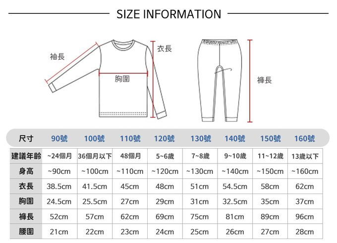 90[身高~90cm;體重10~13kg]、100[身高90~100cm;體重13~16kg]、110[身高100~110cm;體重16~18kg]、120[身高110~120cm;體重18~22kg]、130[身高120~130cm;體重22~27kg]、140[身高130~140cm;體重27~32kg]、150[身高140~150cm;體重33~39kg]、160[身高150~160cm;體重40~46kg]