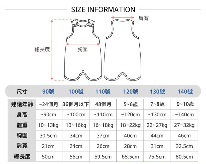 90[身高~90cm;體重10~13kg]、100[身高90~100cm;體重13~16kg]、110[身高100~110cm;體重16~18kg]、120[身高110~120cm;體重18~22kg]、130[身高120~130cm;體重22~27kg]、140[身高130~140cm;體重27~32kg]