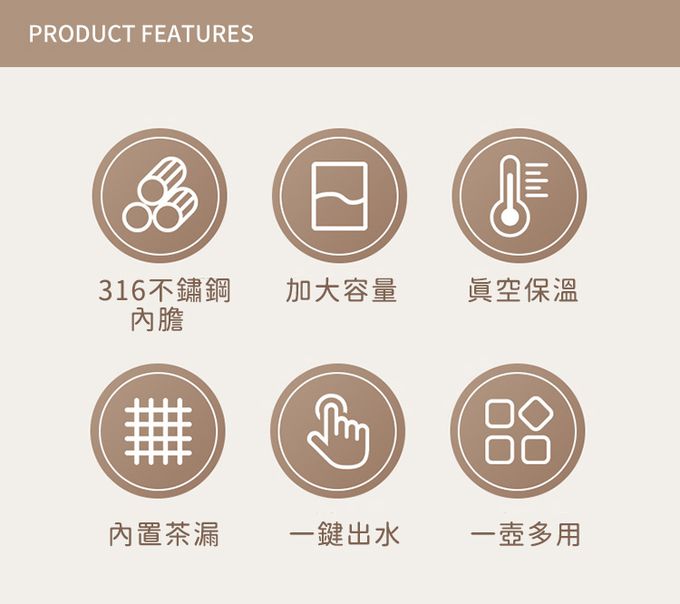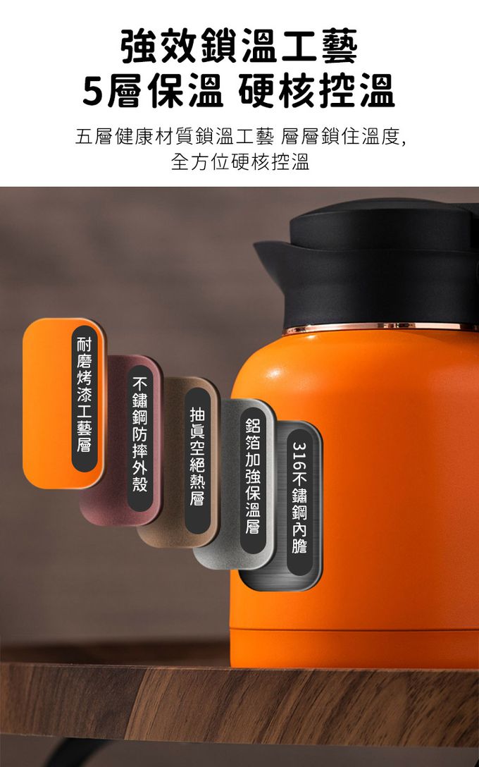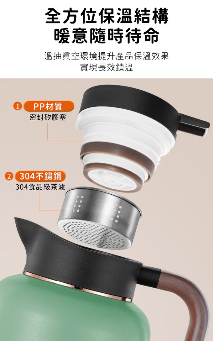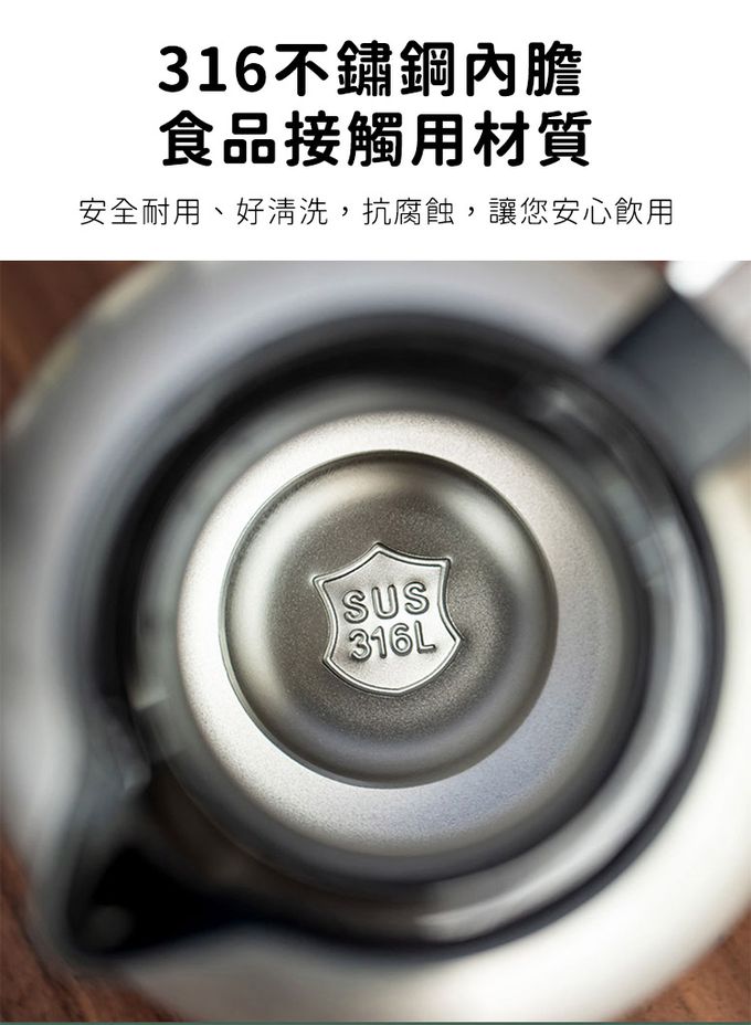 材質:內膽/316不鏽鋼、外/304不鏽鋼、食品級PP壺蓋、密封矽膠圈 手柄/ABS塑膠(仿木紋)