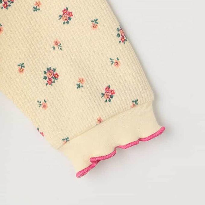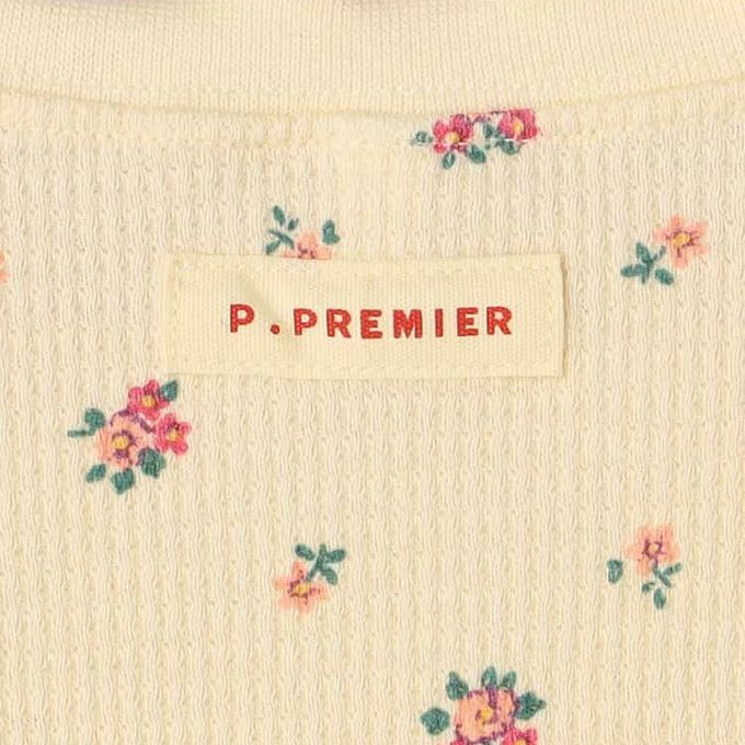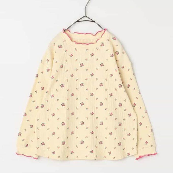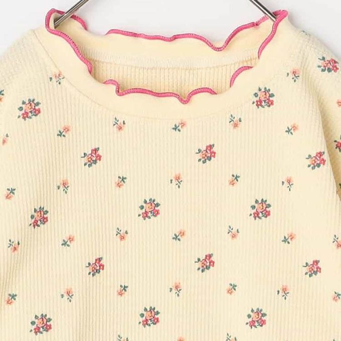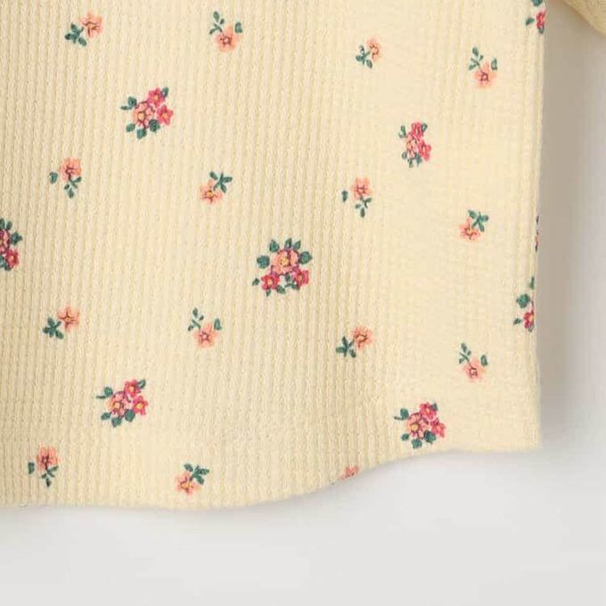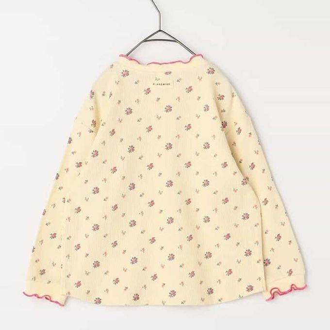 日本 p.premier - 華夫格木耳邊設計感印花長袖上衣-小花-奶白