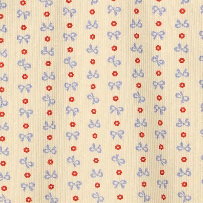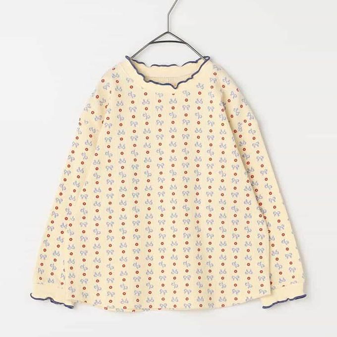 日本 p.premier - 華夫格木耳邊設計感印花長袖上衣-蝴蝶結-白