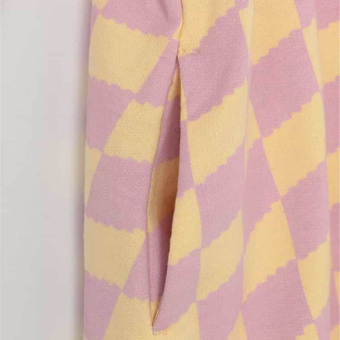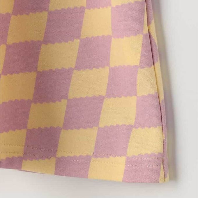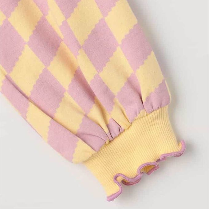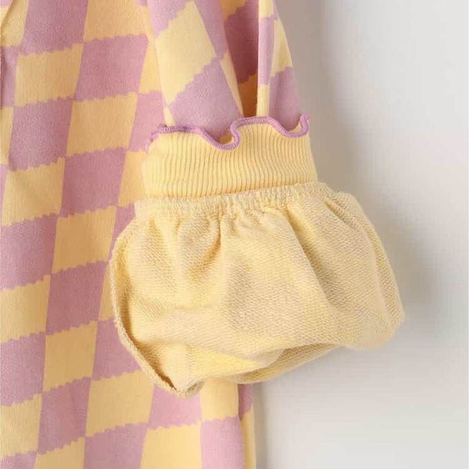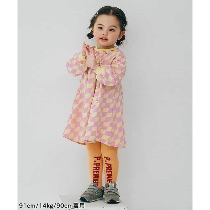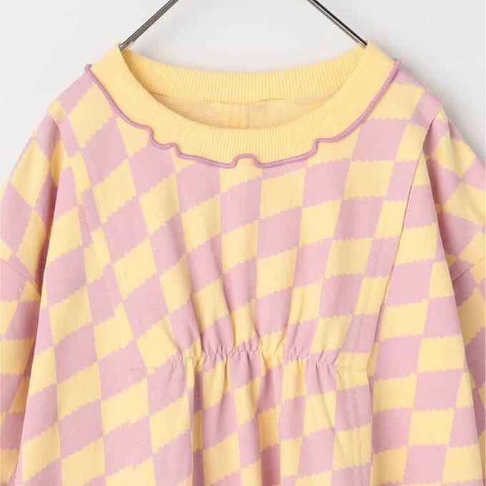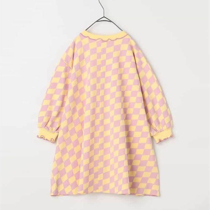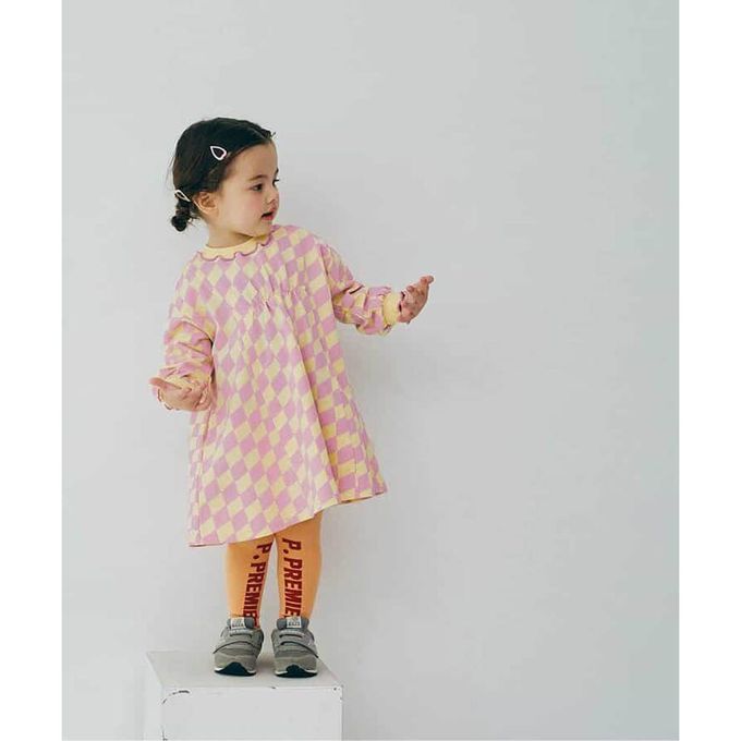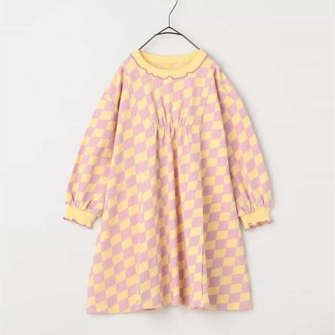 日本 p.premier - 100%棉 可愛復古印花木耳領長袖洋裝-格子-粉紫X黃
