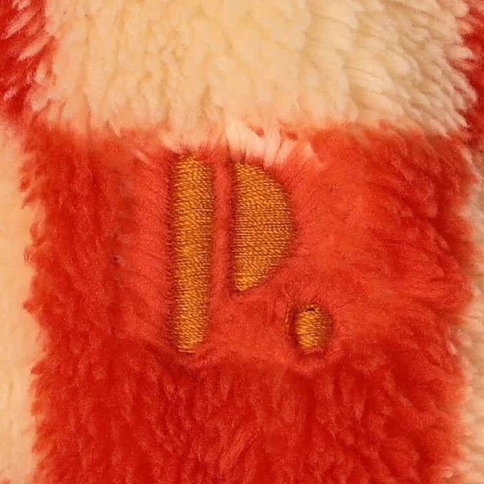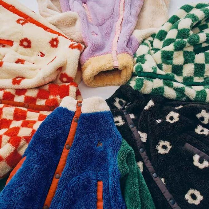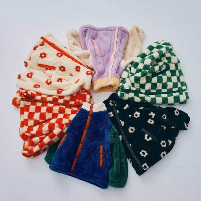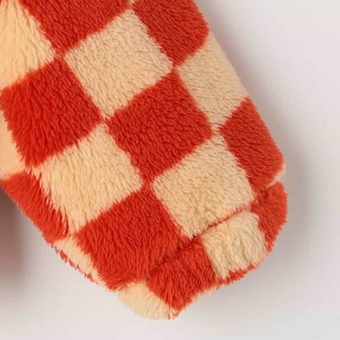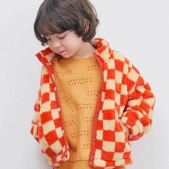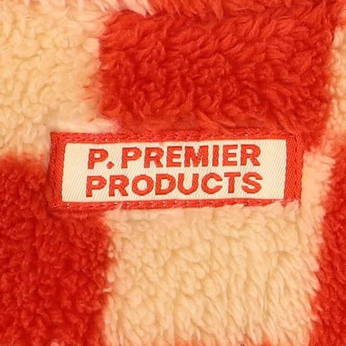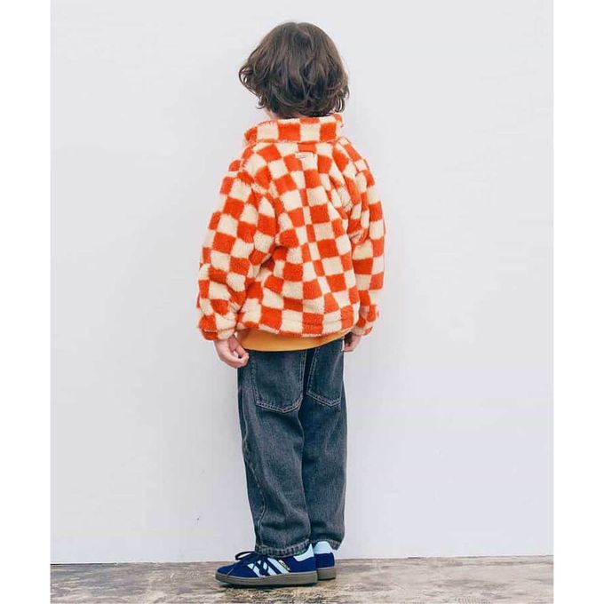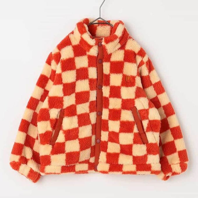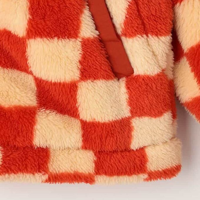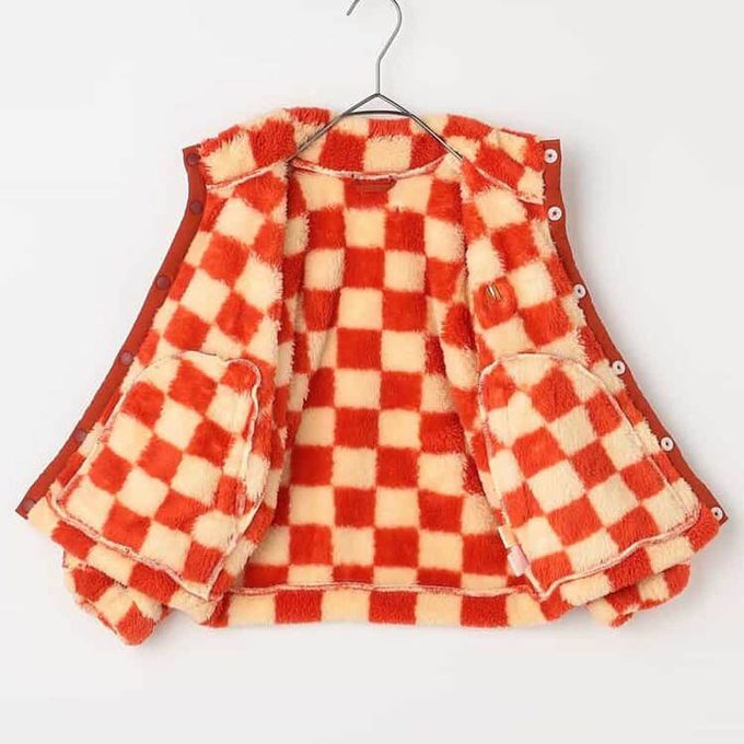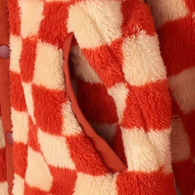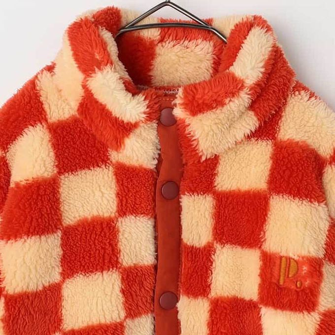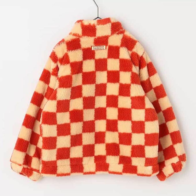 日本 p.premier - 繽紛感印花絨毛保暖外套-格子-橘紅X白