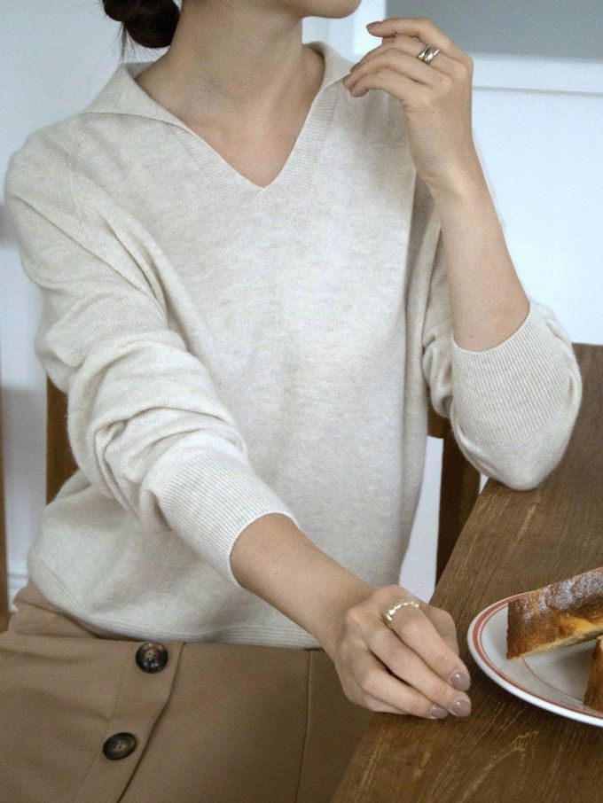 韓國女裝連線 - 柔軟美麗諾羊毛無縫V字翻領長袖針織上衣-燕麥米 (FREE)