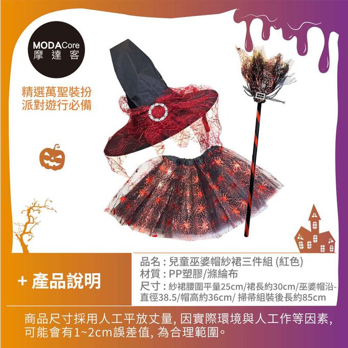 品名:★cosplay派對裝扮變裝★兒童巫婆帽紗裙三件組-紅色 裙子/髮箍/掃帚