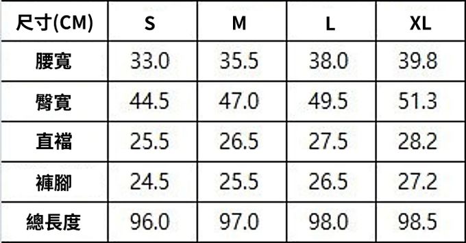 1. 尺寸表單位皆為公分(cm),實際尺寸會因布料彈性、水洗、測量起迄點等因素略有誤差。
