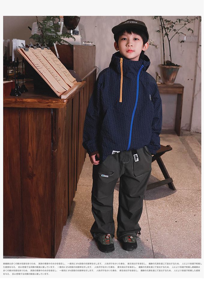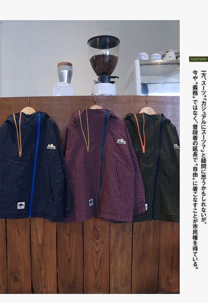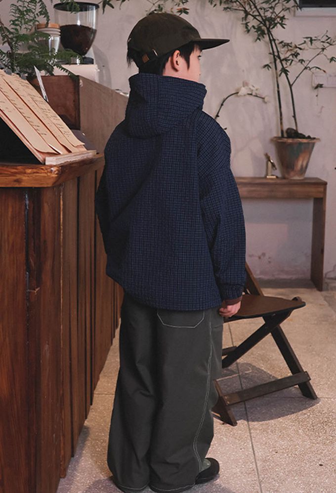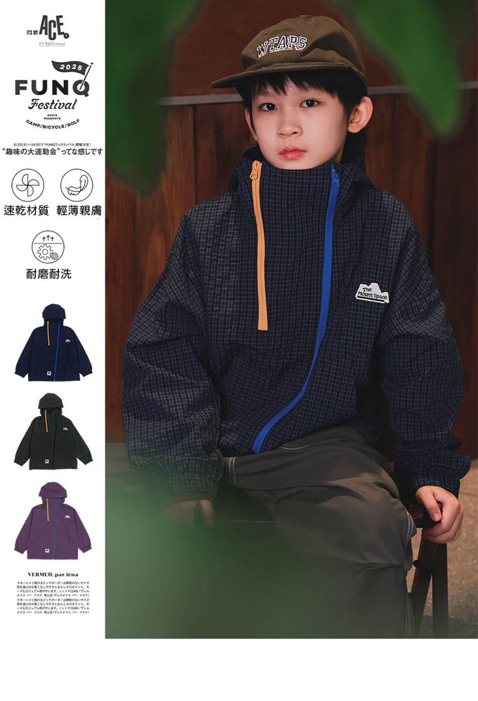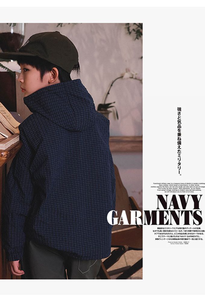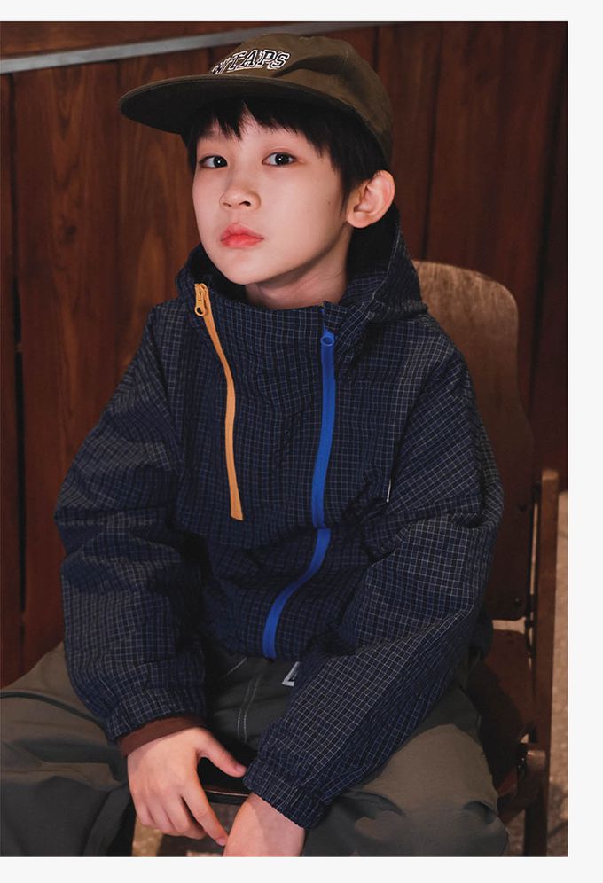 Y B S - 撞色雙拉鍊立領防風連帽外套-藏青格