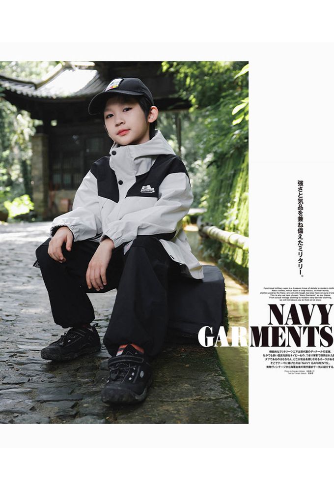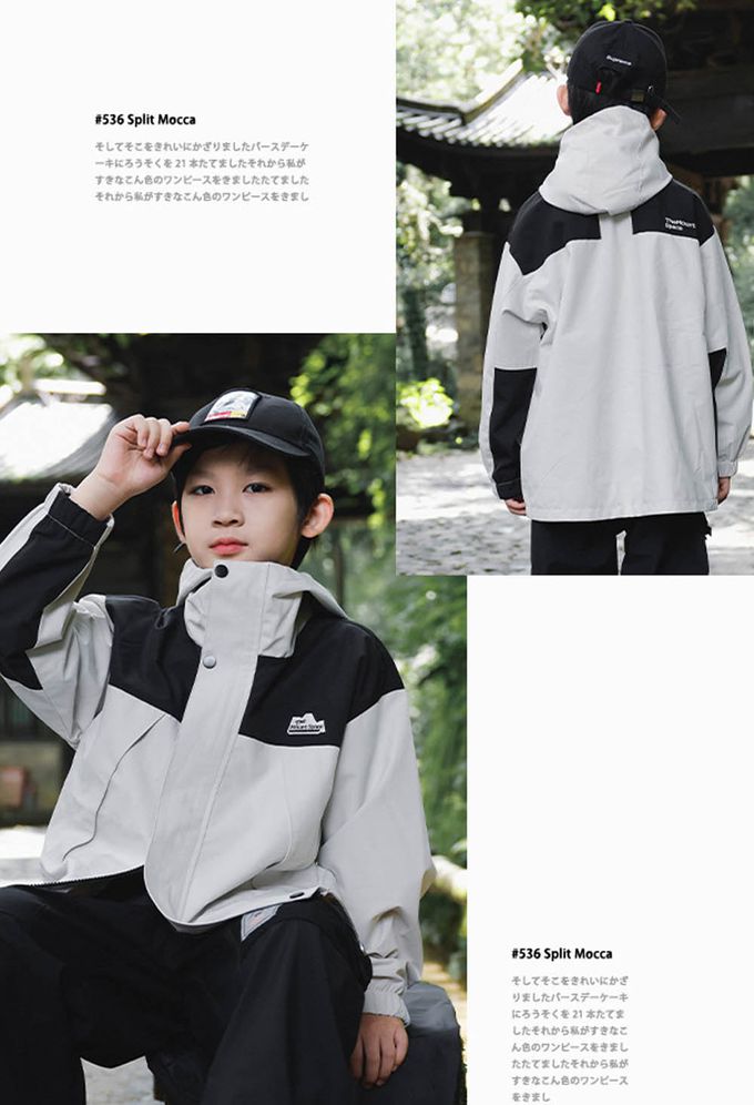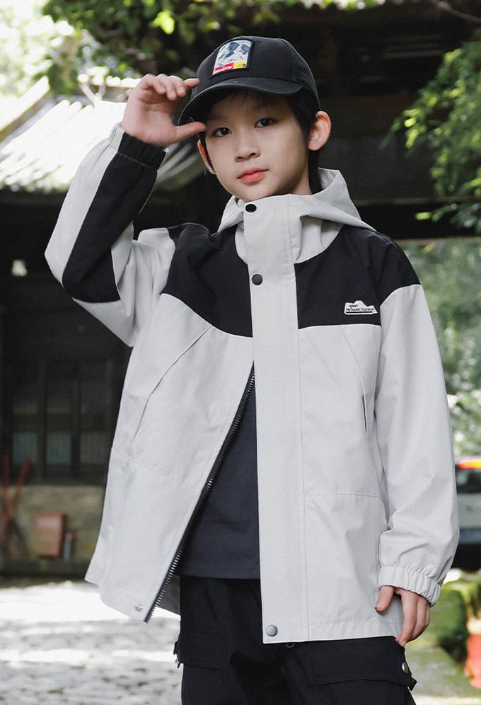 防潑水撞色立領防風連帽外套-山系徽章-灰白
