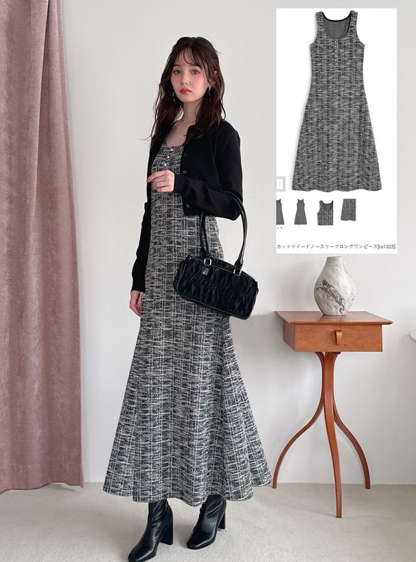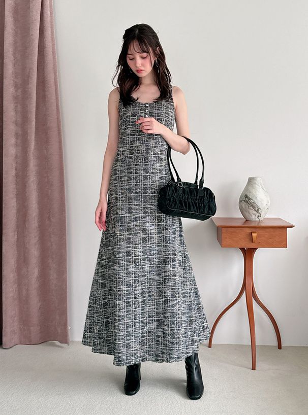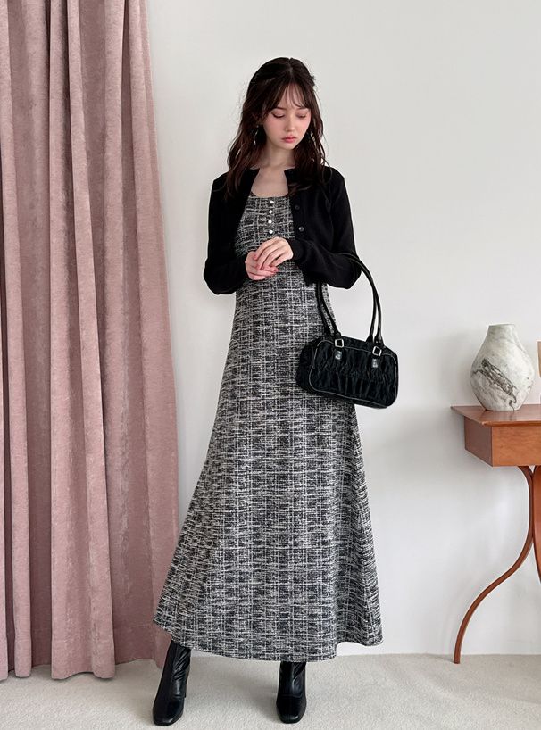 日本 GRL - 粗花呢寶石扣背心喇叭裙長洋裝-黑系